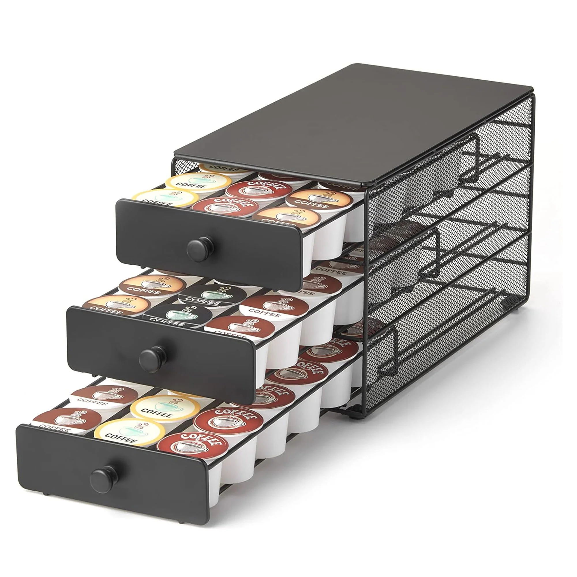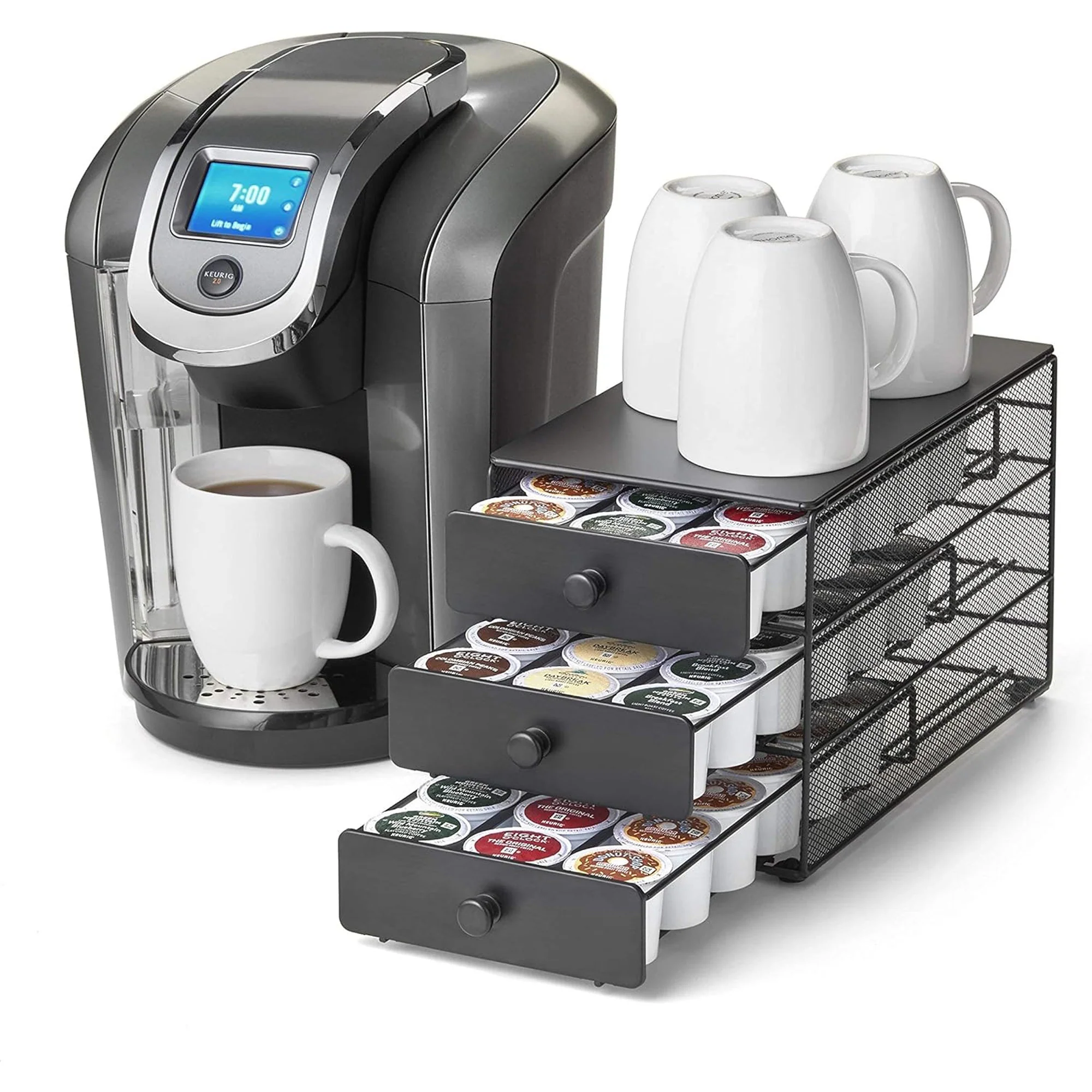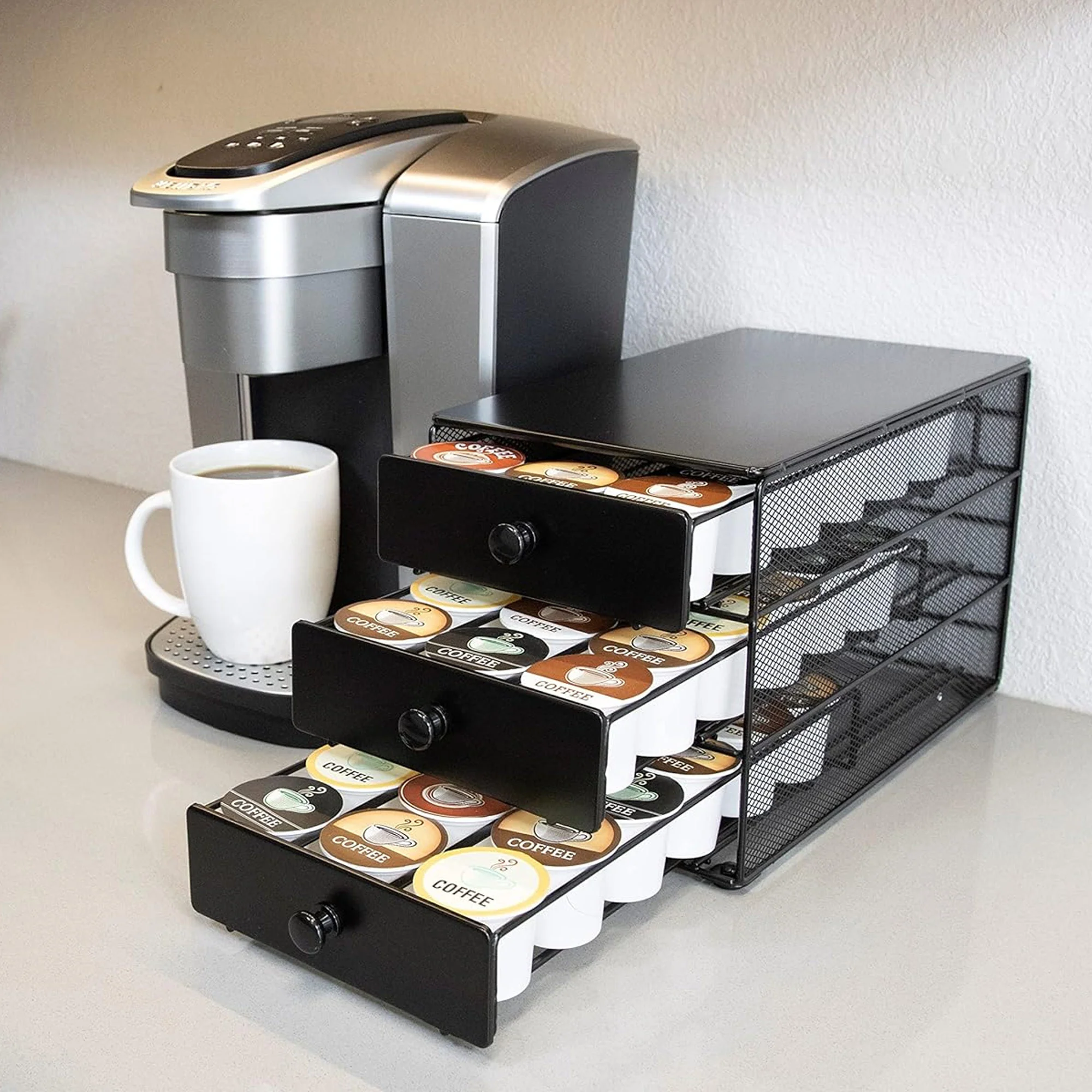 Tame Your K-Cup Chaos with This Sleek Organizer. Banish messy coffee pod drawers with the Black Satin K-Cup Organizer! This stylish three-tier holder lets you store a whopping 54 K-Cups, keeping your favorite flavors organized and within reach. The sleek black satin finish complements any kitchen or office décor, and the compact design maximizes counter space.