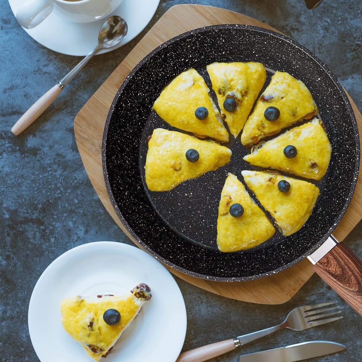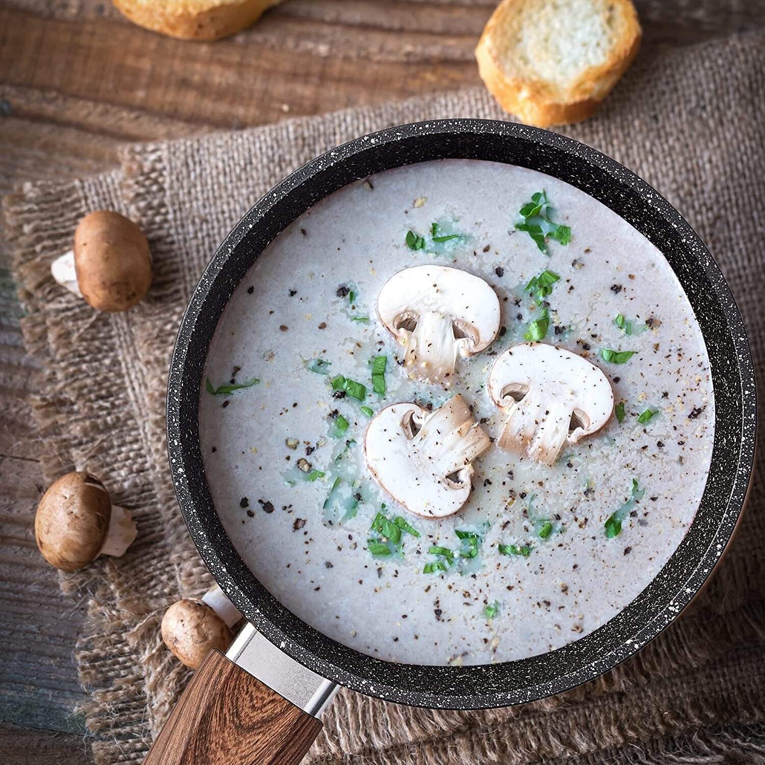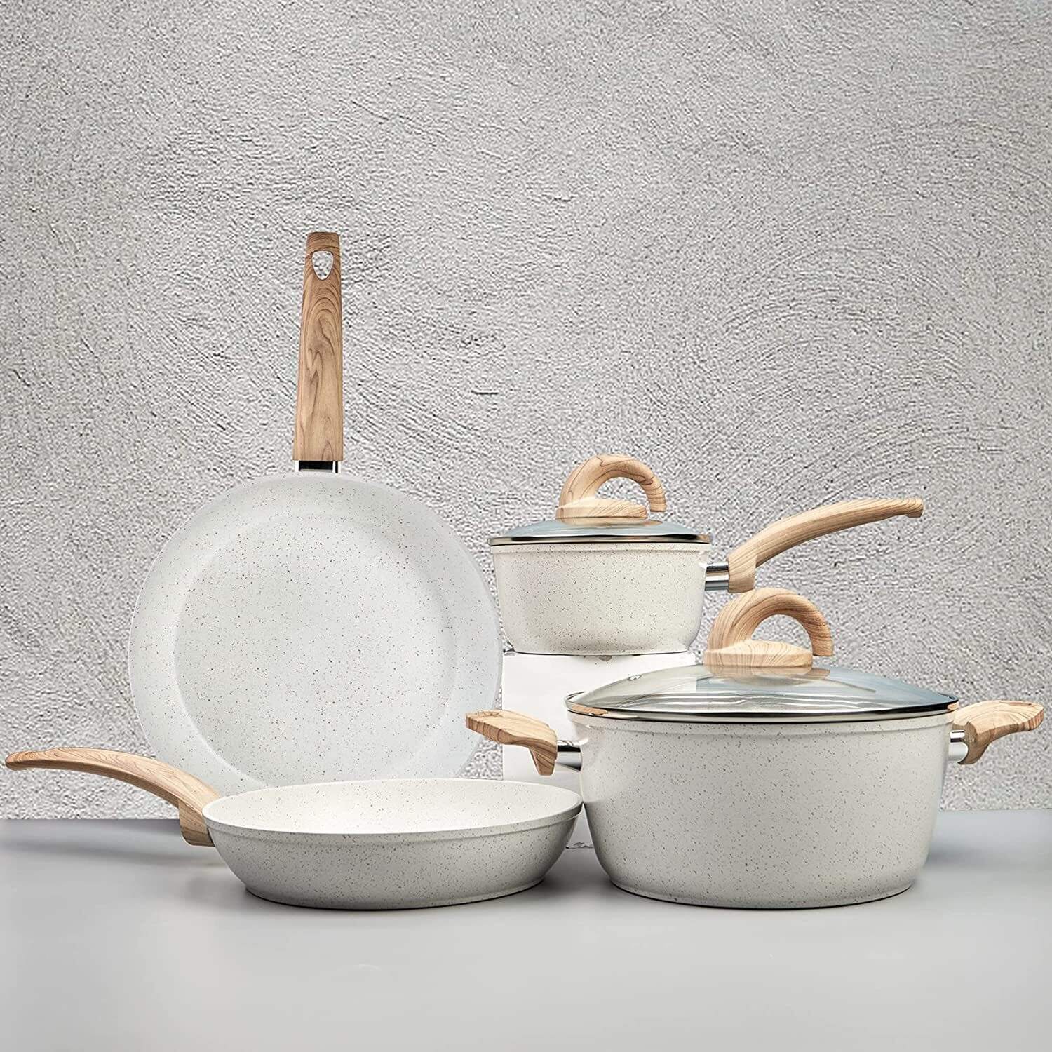 Suitable For All Stoves ¨C High magnetic conductive stainless steel base allows our non stick granite kitchen cookware to work on all cooktops, like Electric, Halogen, Ceramic, Gas, Induction and Oven. The Extended and Thicken Bottom Design also makes the cookware durable and heats up quickly and evenly.
