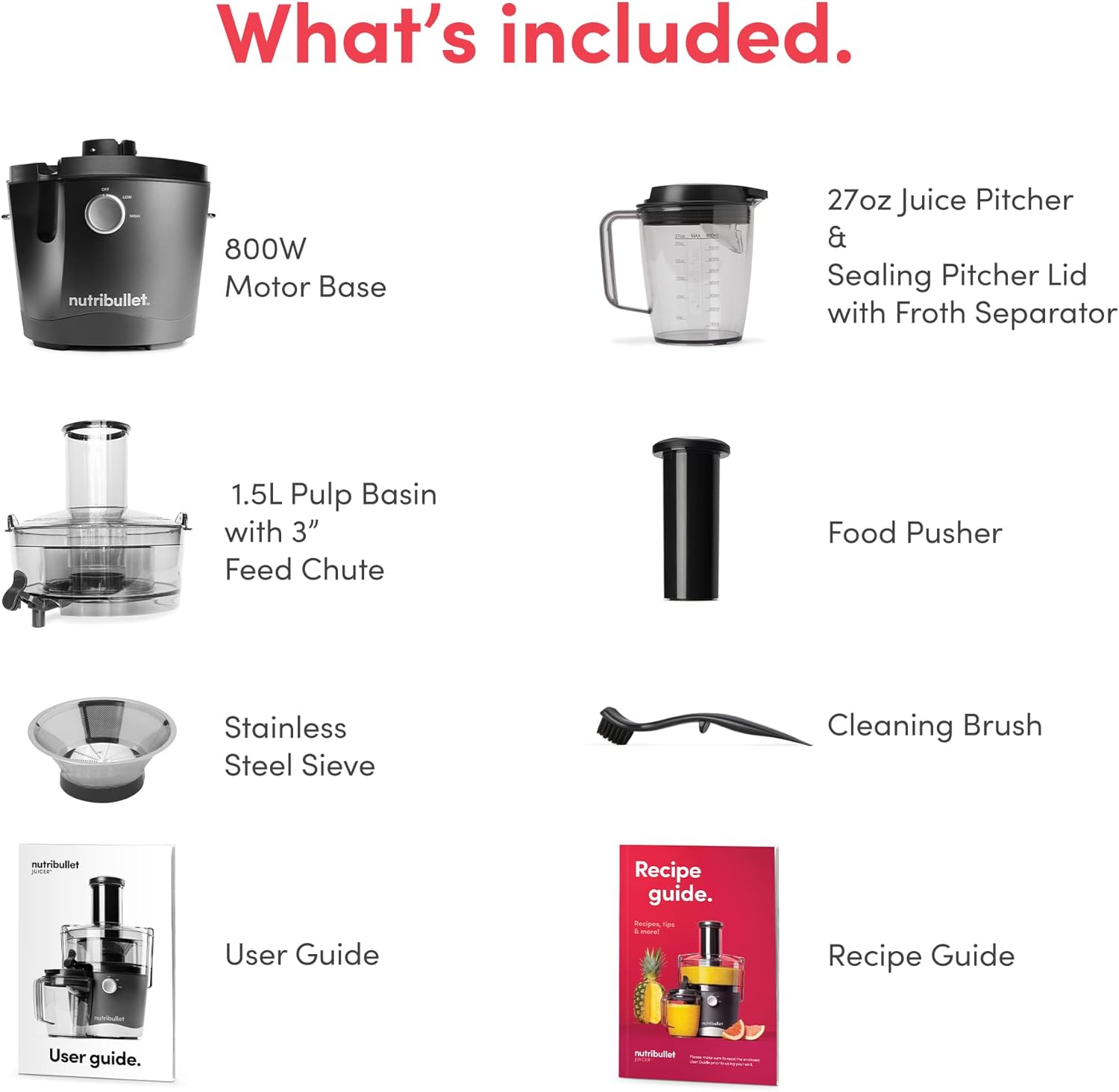 • Includes: (1) 800W Motor Base, (1) 1.5L Pulp Basin with 3” wide feed chute, (1) Stainless Steel Sieve, (1) 27oz Juice Pitcher (1) Sealing pitcher lid with froth separator, (1) Food Pusher, (1) Cleaning Brush and User & Recipe Guides