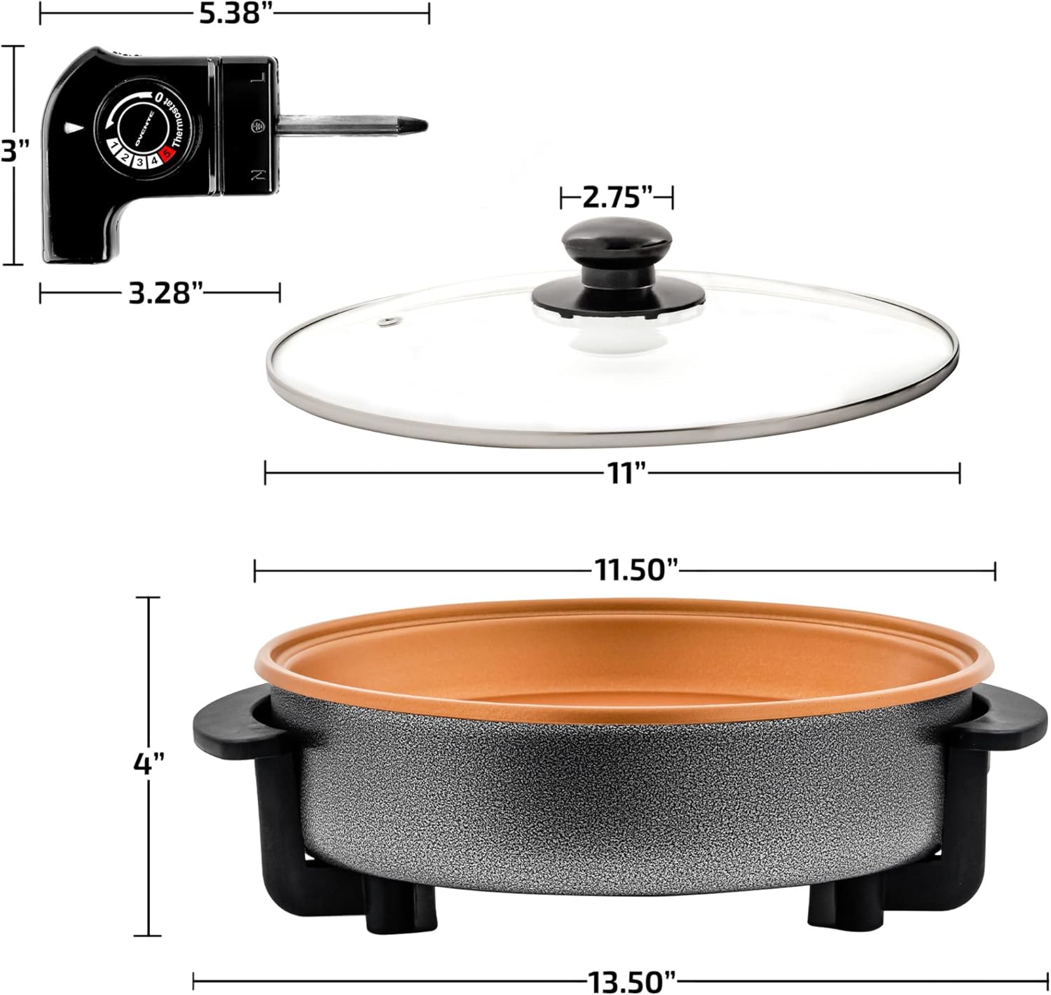 - SPACIOUS – The 12-inch size accommodates stew, sauce, and stir-fry meals. Our electric frying pan is versatile, perfect for cooking family favorites or trying new recipes like omelets, risottos, ratatouilles, paellas; the list is endless.