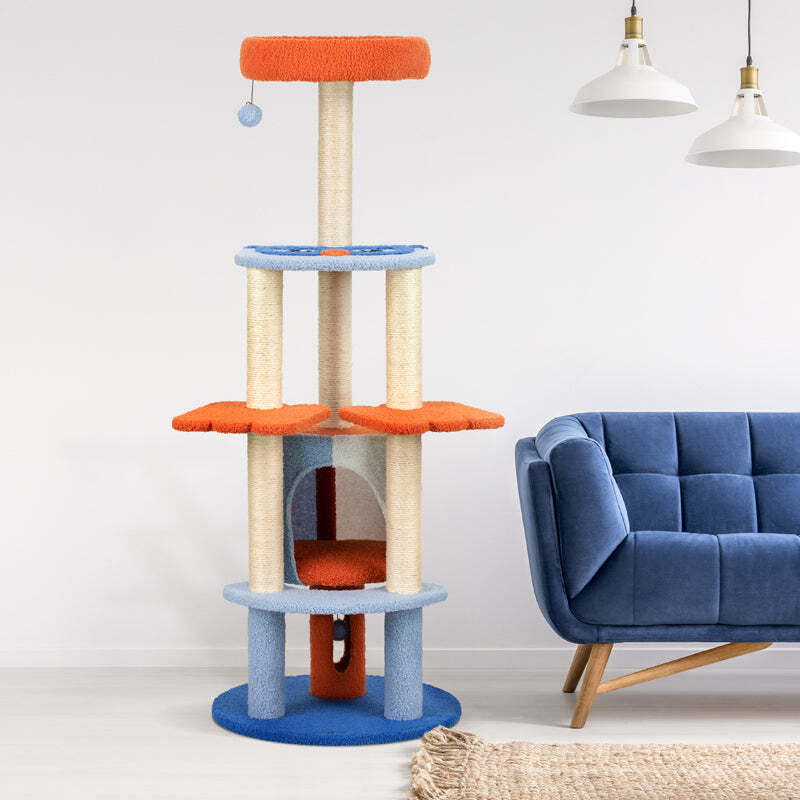 High-quality material: Cat tower is made of high-quality particle board, covered with flannel, soft and comfortable. The branches of the flowers have built-in iron pipe pillars, which are strong and durable; the surface is soft with flannelette.