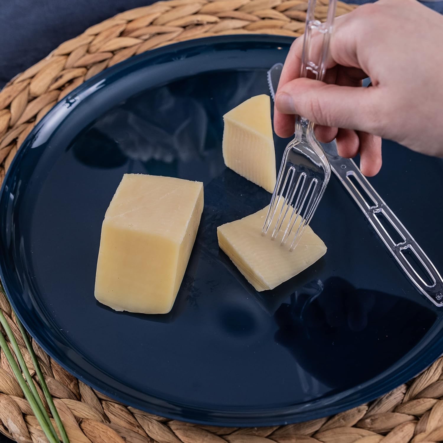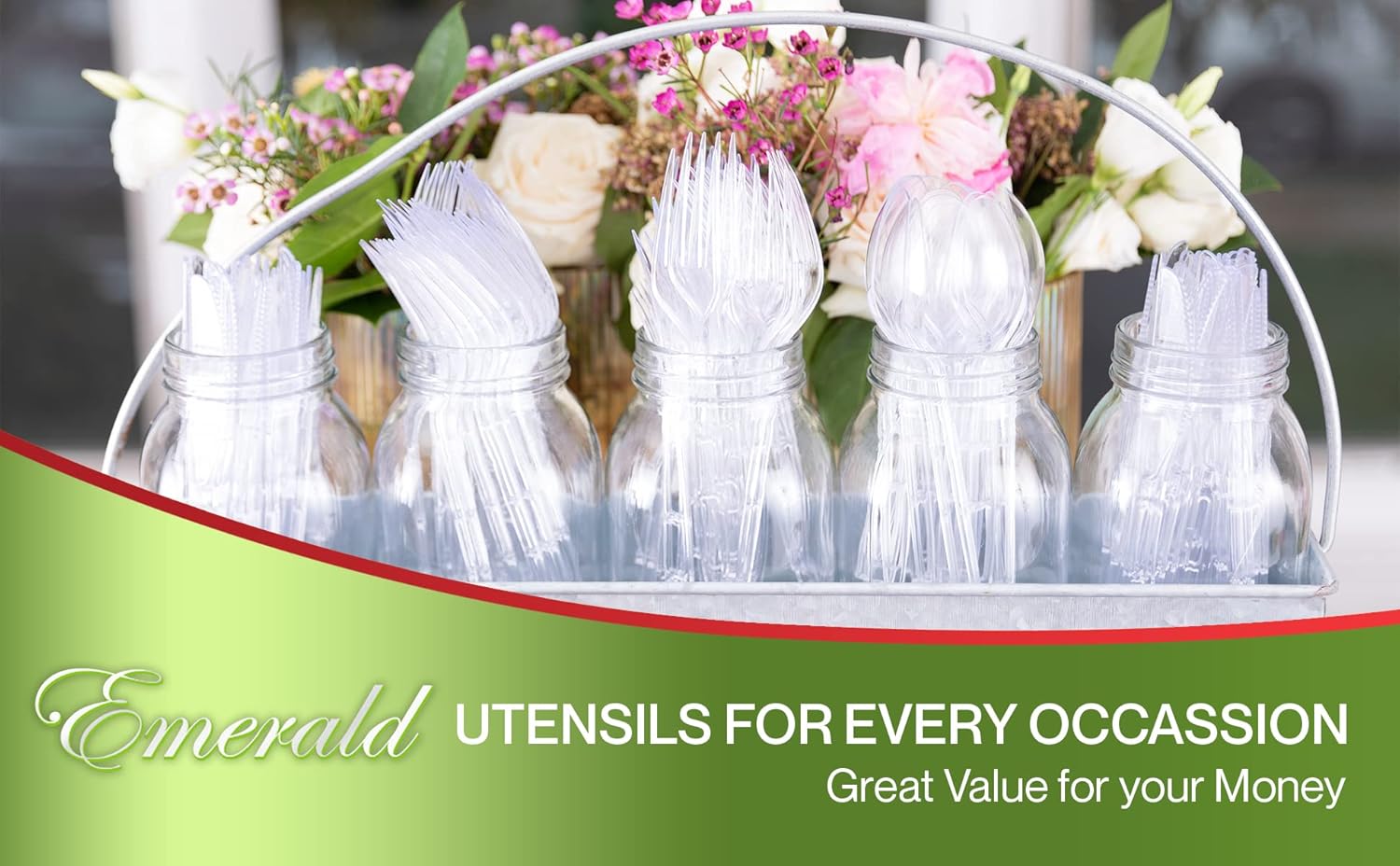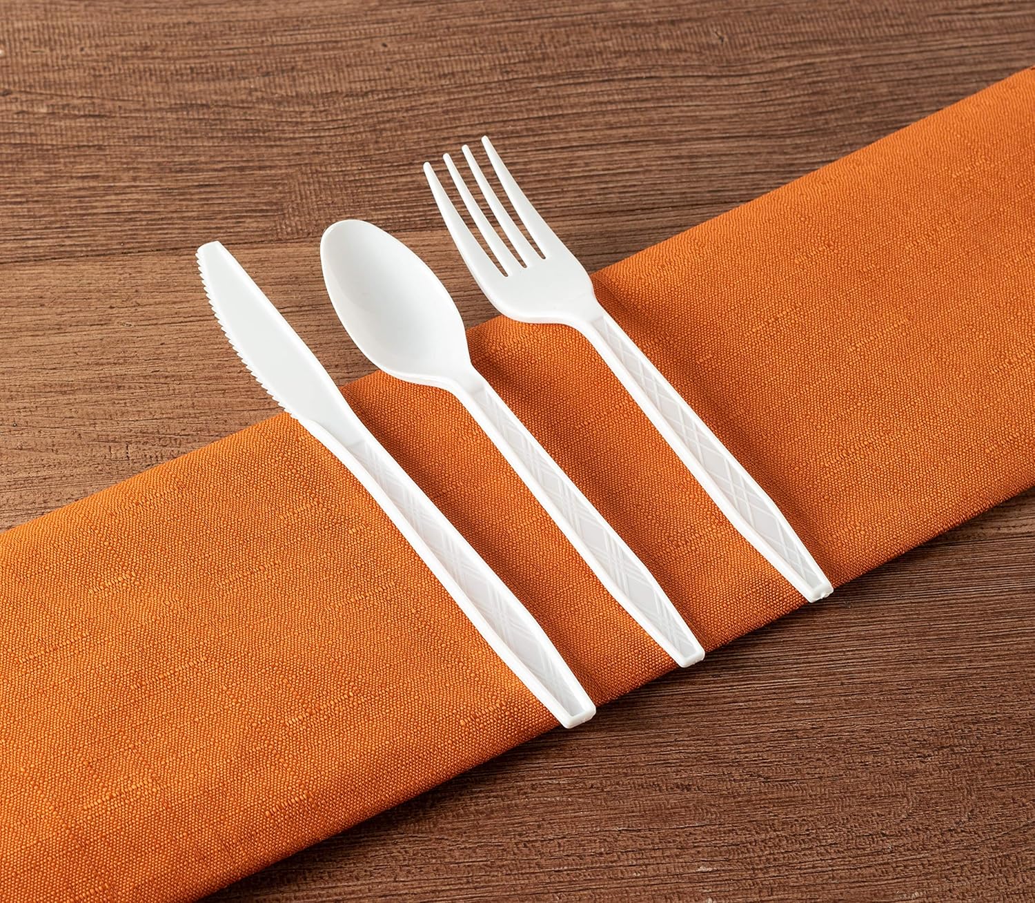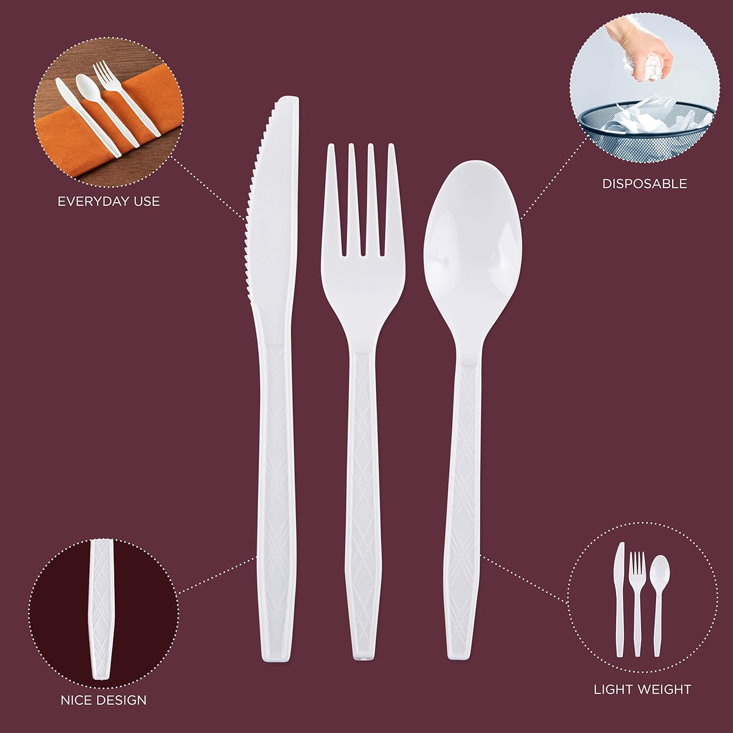 - ✅DURABLE: Heavy duty plasticware. Knives slice without breaking, strong forks spear food, spoons for hot or cold liquids.