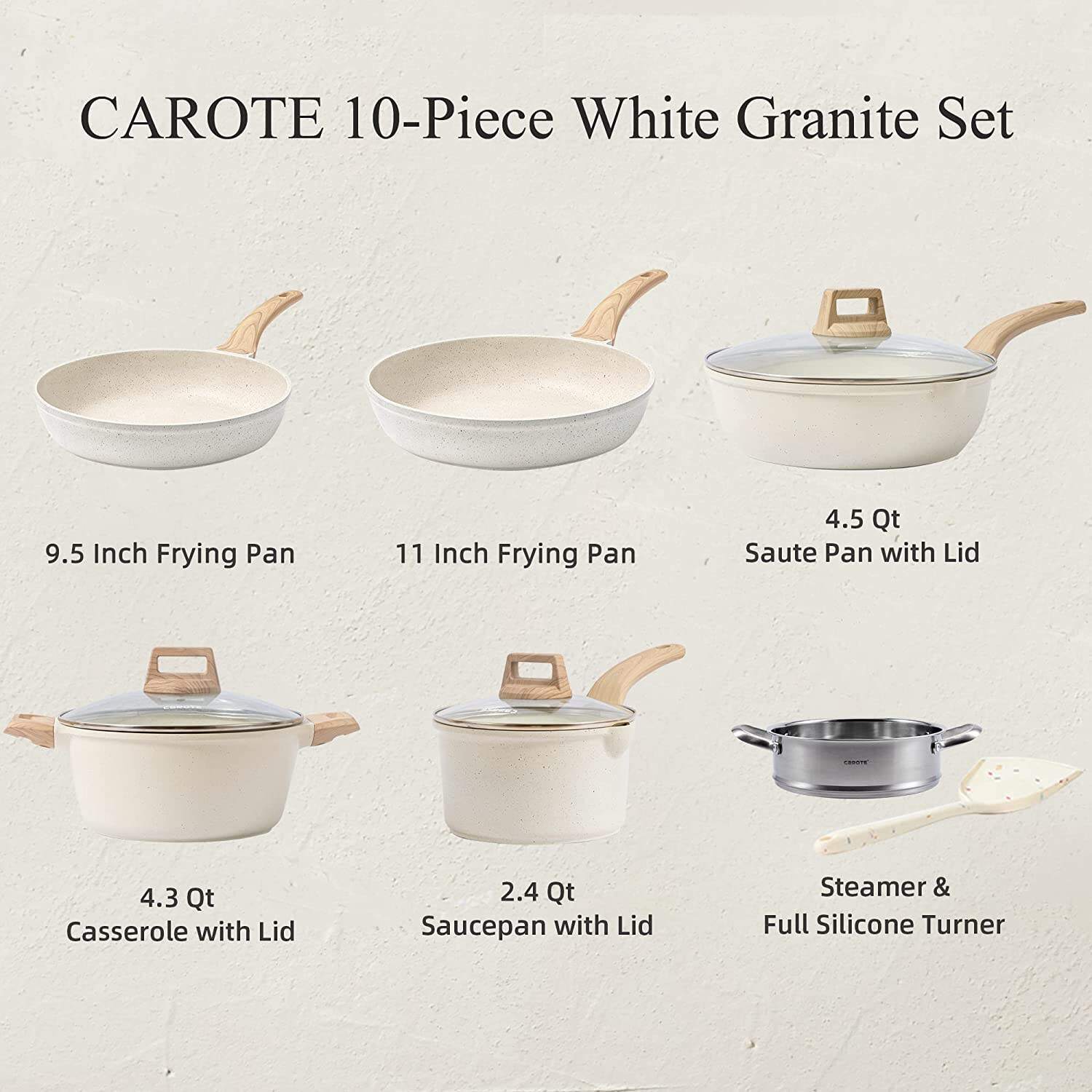 - 10-Piece Cookware Set Includes :9.5 inch/11 inch Frying Pan+2.4 QT Saucepan with Lid and Steamer+4.3QT Casserole Pot with Lid+4.5QT Saute Pan with Lid+White Silicone Turner. Our favorite non stick pots and pans set meets all your need for every day cooking