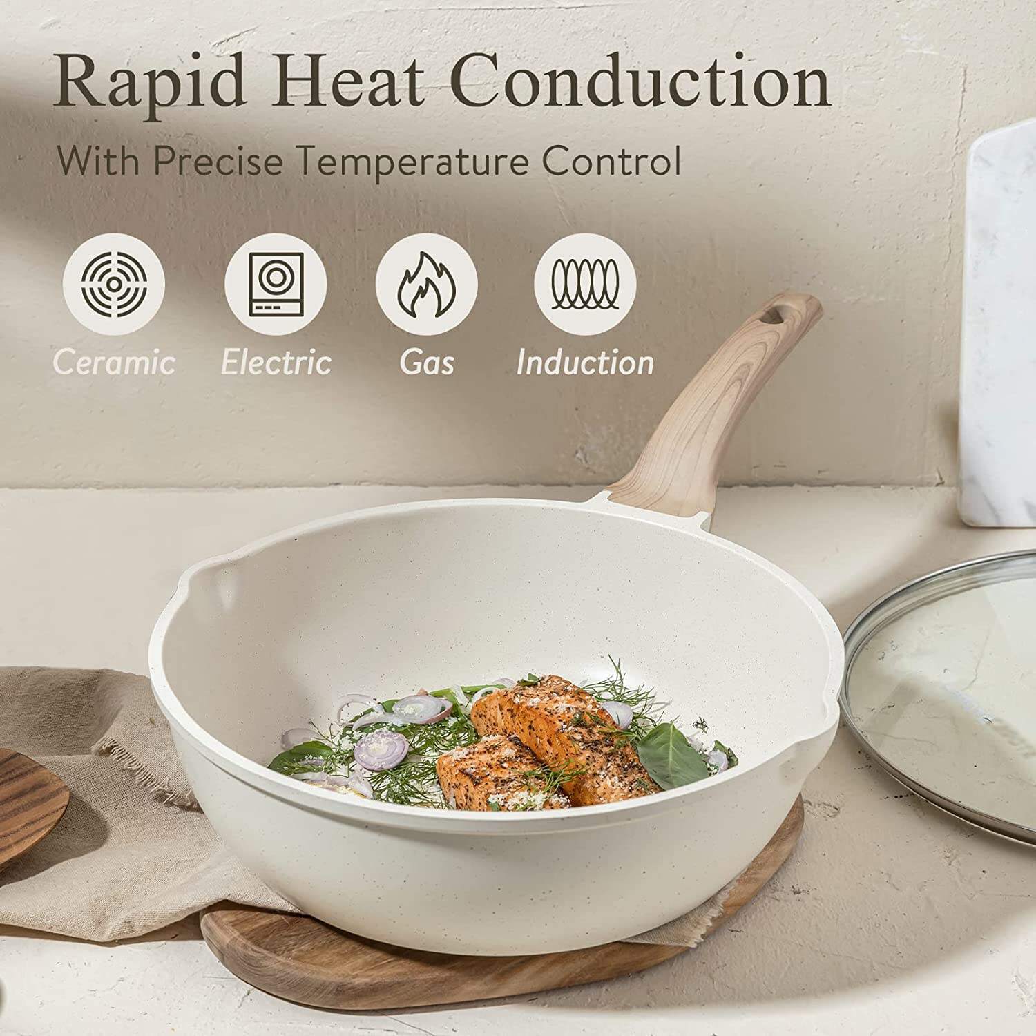- Suitable For All Stoves C Heats up quickly and evenly with extended bottom design. High magnetic conductive stainless steel base allows our nonstick cookware to work on all cooktops, including induction.
