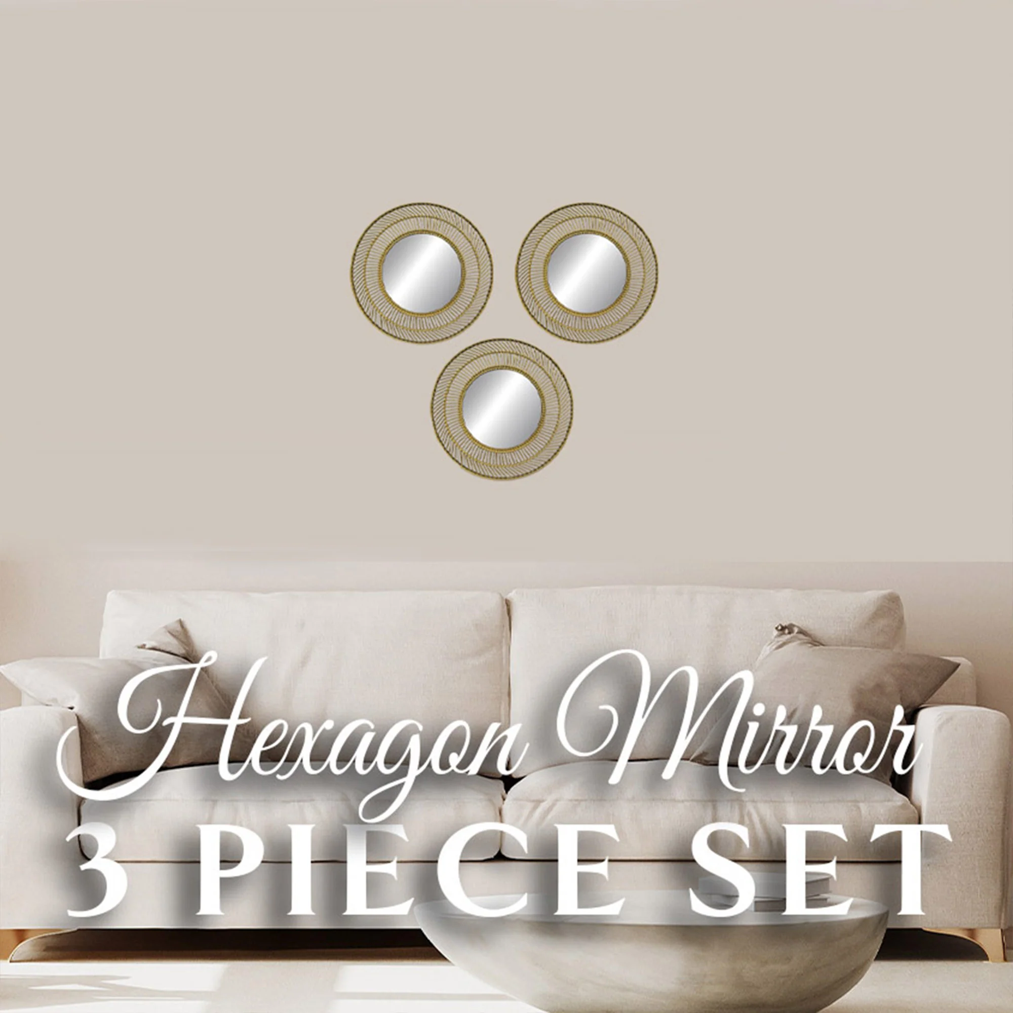 - Set includes: 3 gold-colored plastic mesh circle wall decor mirrors