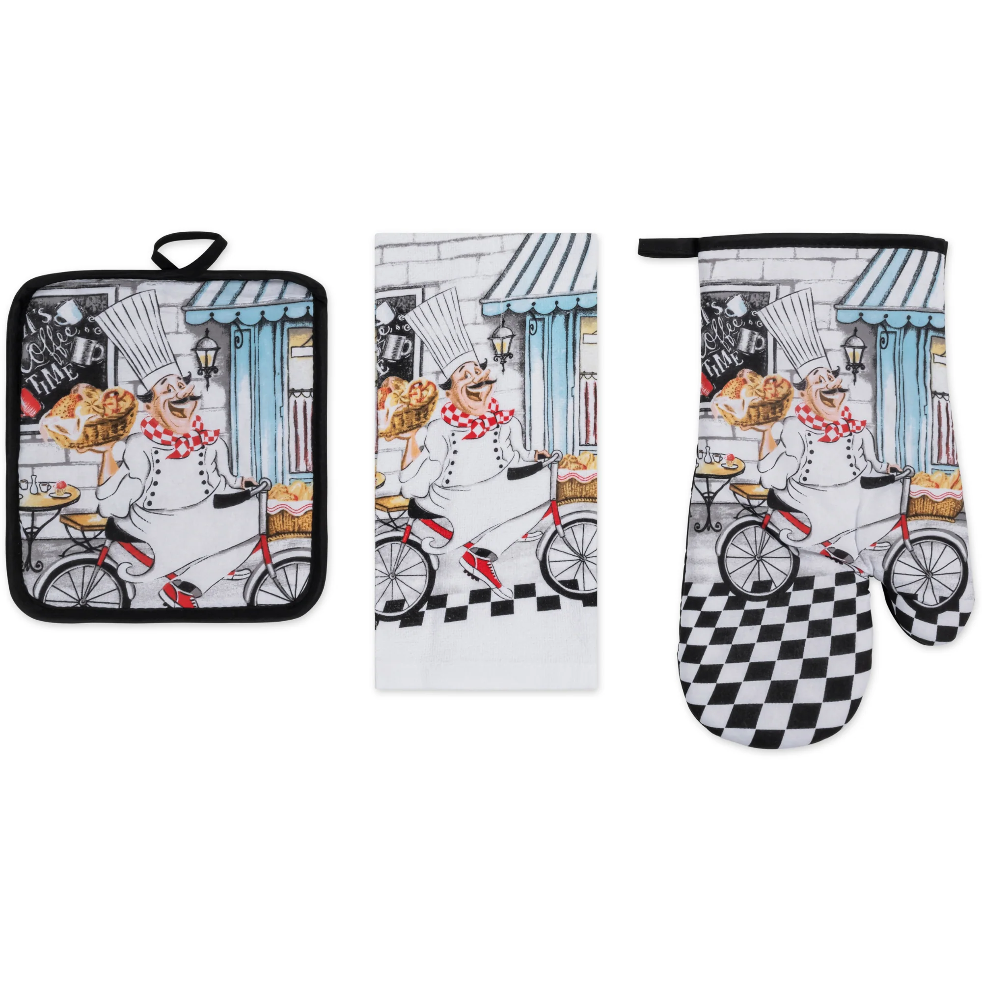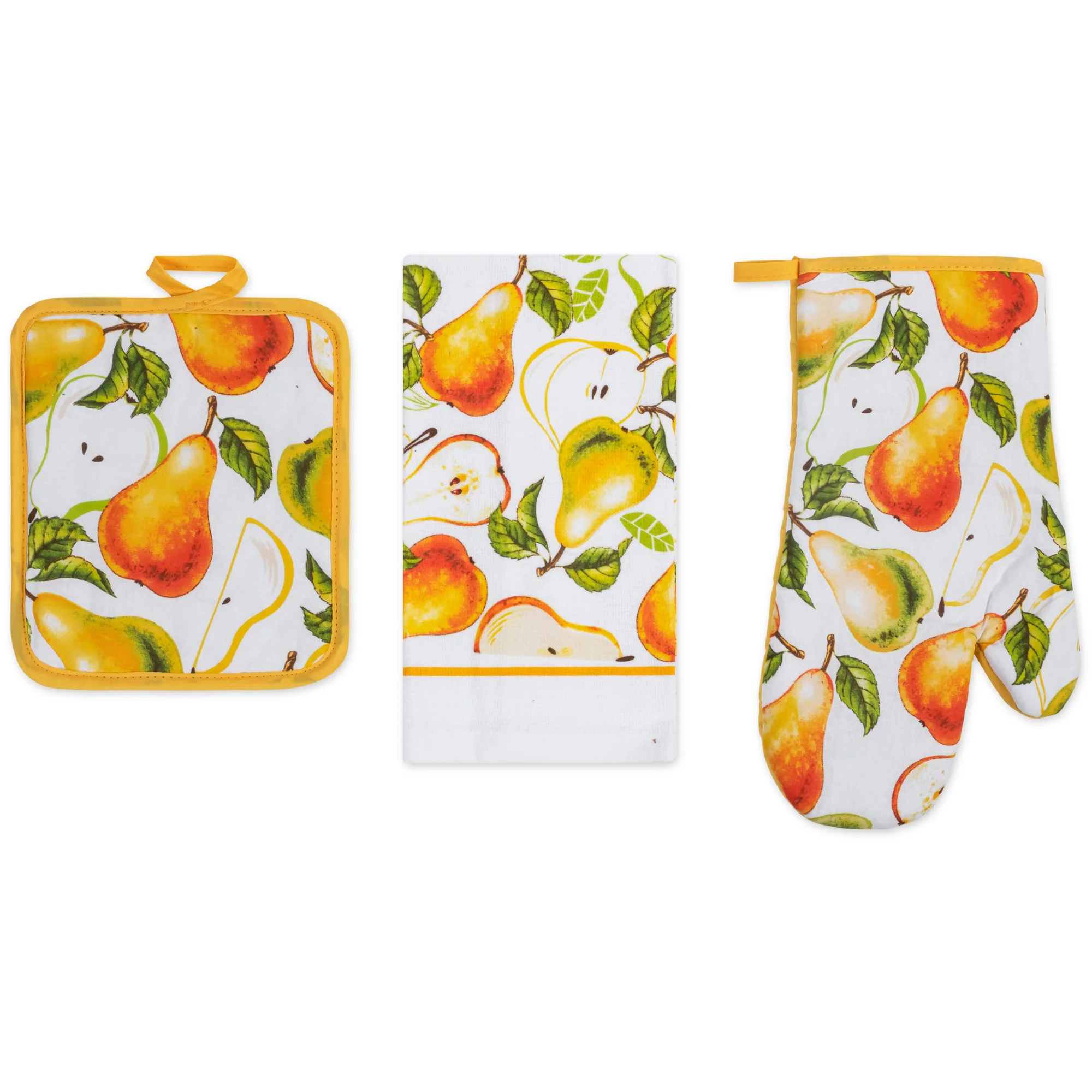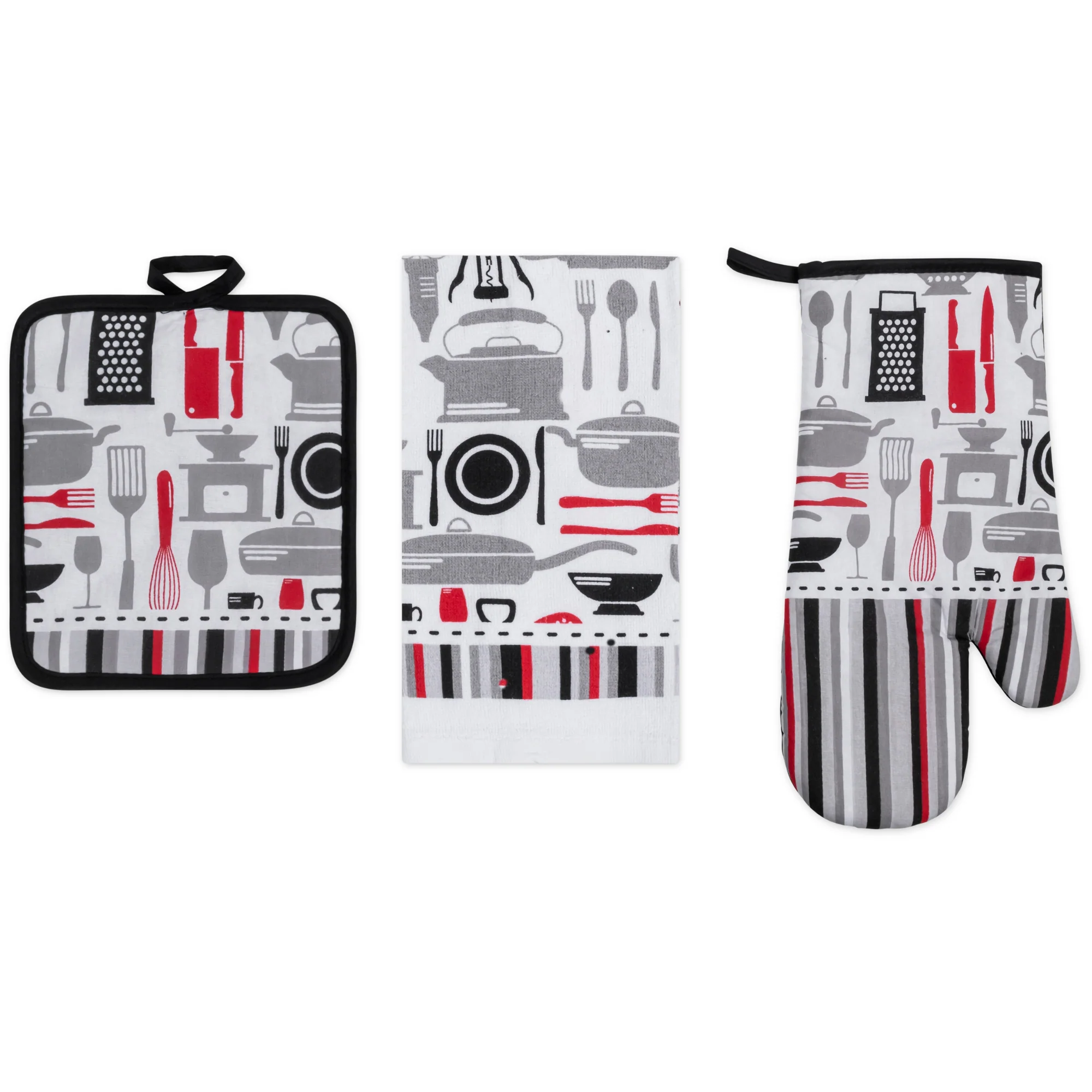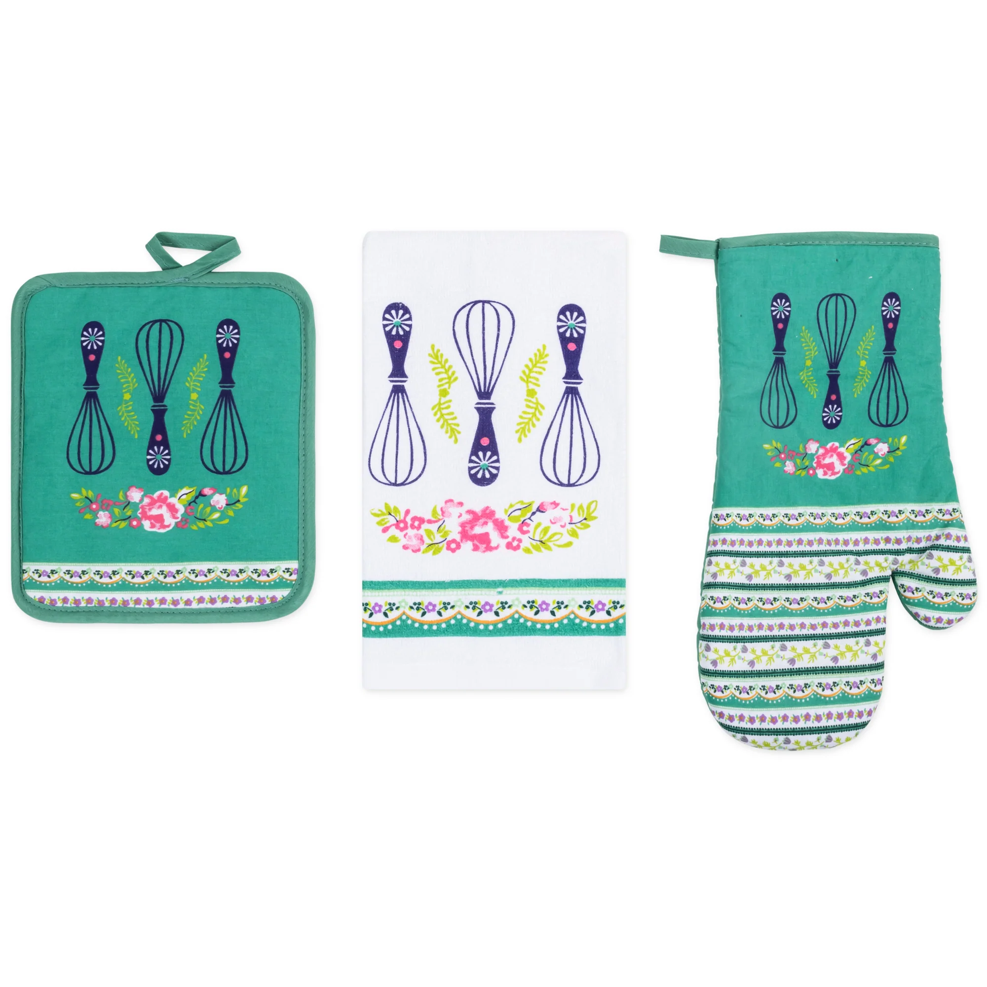 Ditch the mismatched mess and infuse your kitchen with personality and Style! This PREMIUS 3-piece kitchen linen set includes everything you need for culinary creations, all while boasting a design that speaks to you. All 3 pieces are meant to baking serving and of course clean up! Each Set comes with: 1 Oven Mitt, 1 Pot Holder, and 1 Cotton Towel.