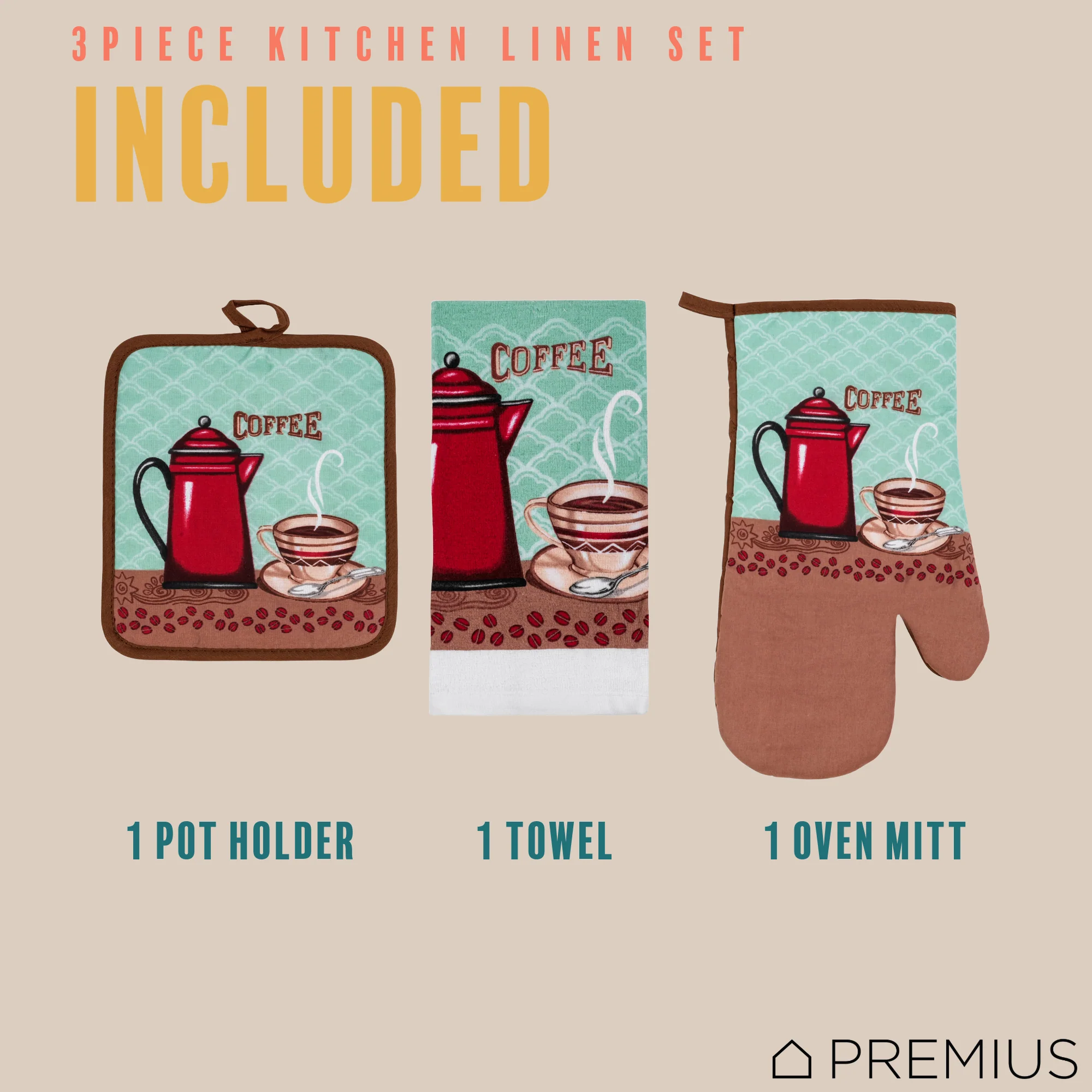 Upgrade your kitchen with this essential PREMIUS 3-piece kitchen linen set and say goodbye to mismatched dish towels and oven mitts and Pot Holder!