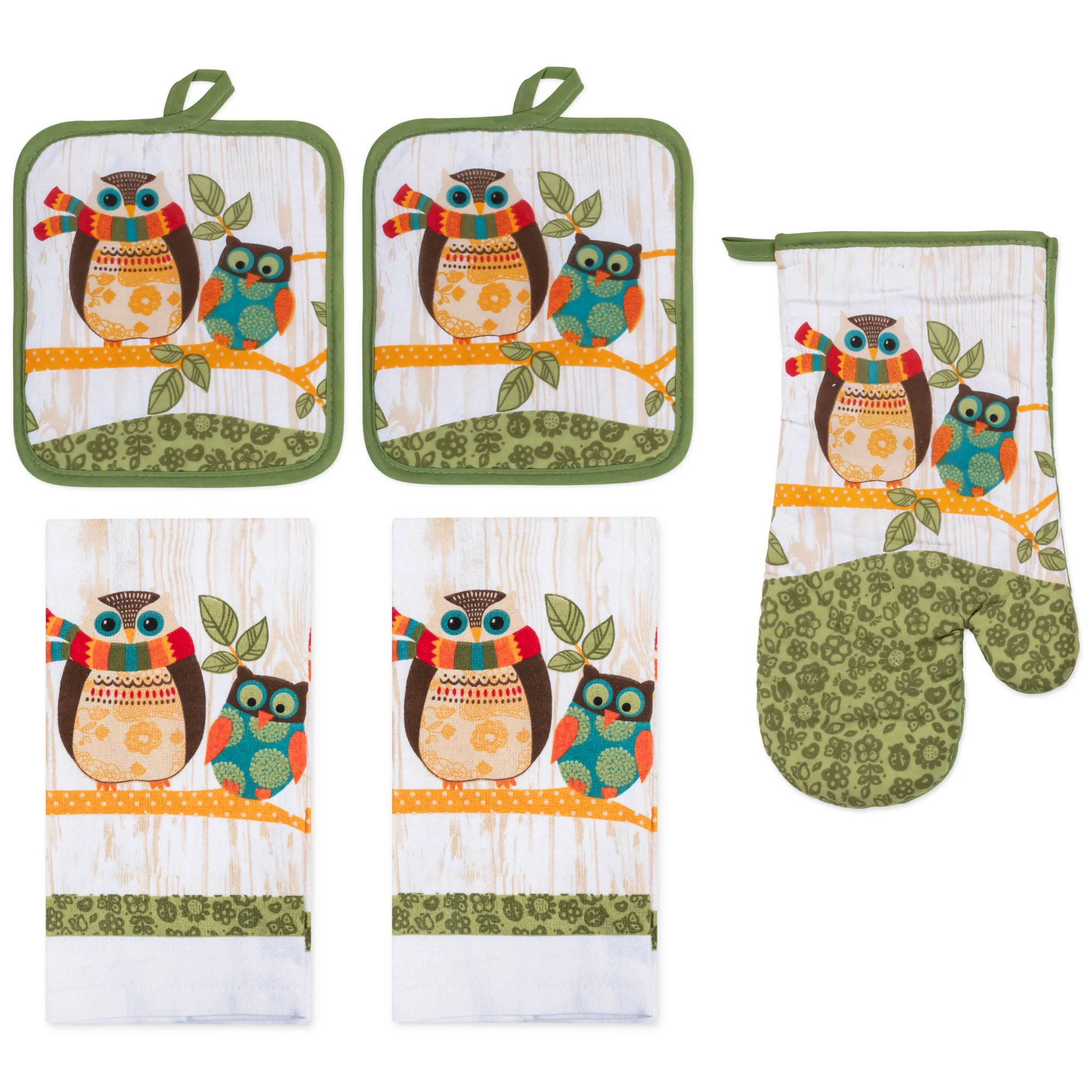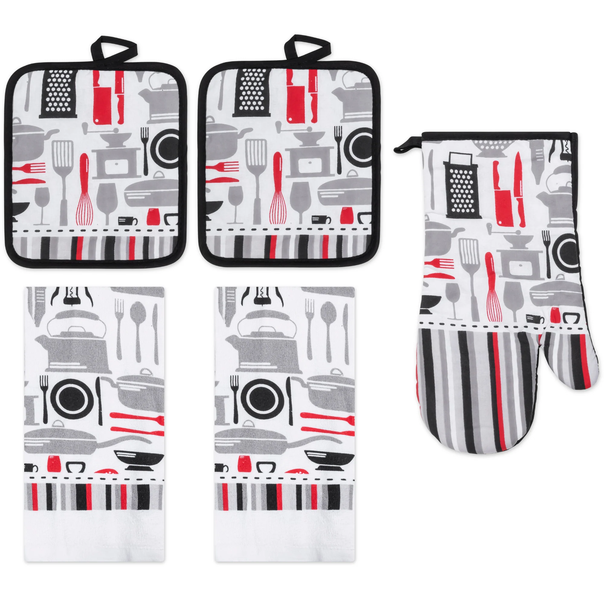 Ditch the mismatched mess and infuse your kitchen with personality and style! This PREMIUS 5-piece set includes everything you need to tackle any culinary creation, all while boasting a design that reflects your unique taste. All 5 pieces are meant to baking serving and of course clean up! Each Set comes with: 1 Oven Mitt, 2 Pot Holder, and 2 Cotton Towels.