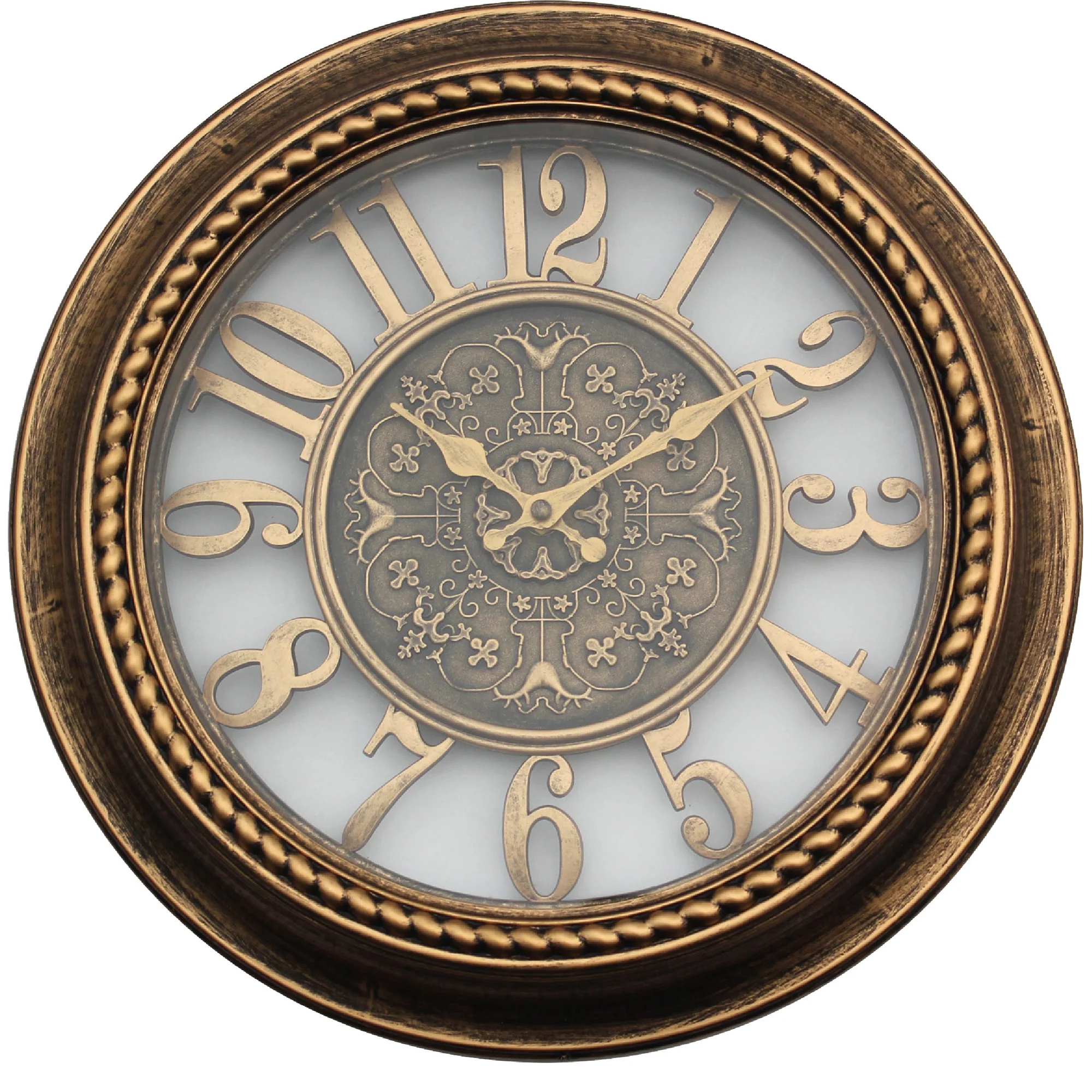 This 15-inch round clock injects a dose of industrial charm into any space. The unique design features bold, rope-like numerals wrapped around a sleek metal frame, available in Gold.