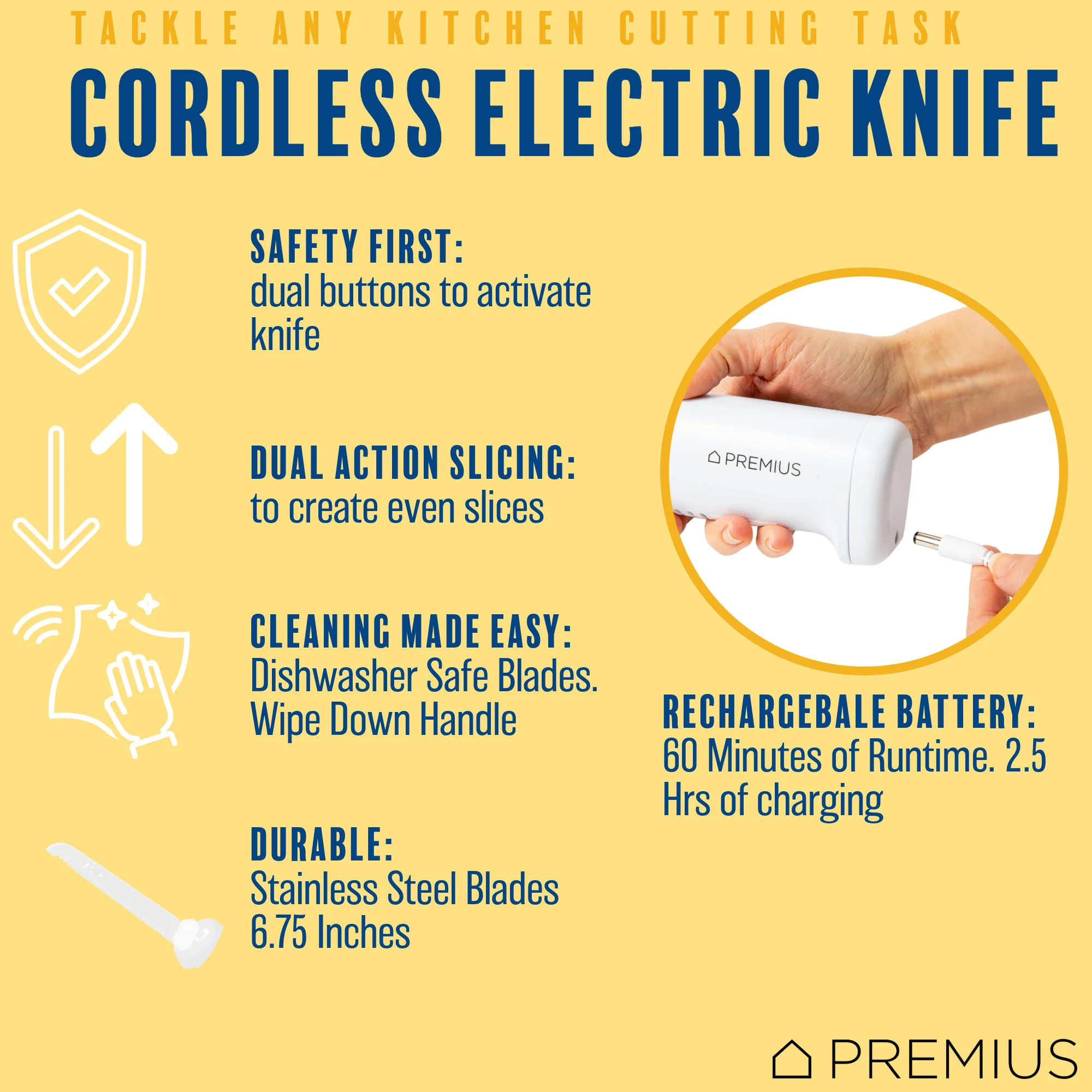 - Weight: 2.6 lbs (with blade) Upgrade your kitchen arsenal with the PREMIUS Cordless Electric Knife, designed for efficiency, precision, and ease of use.