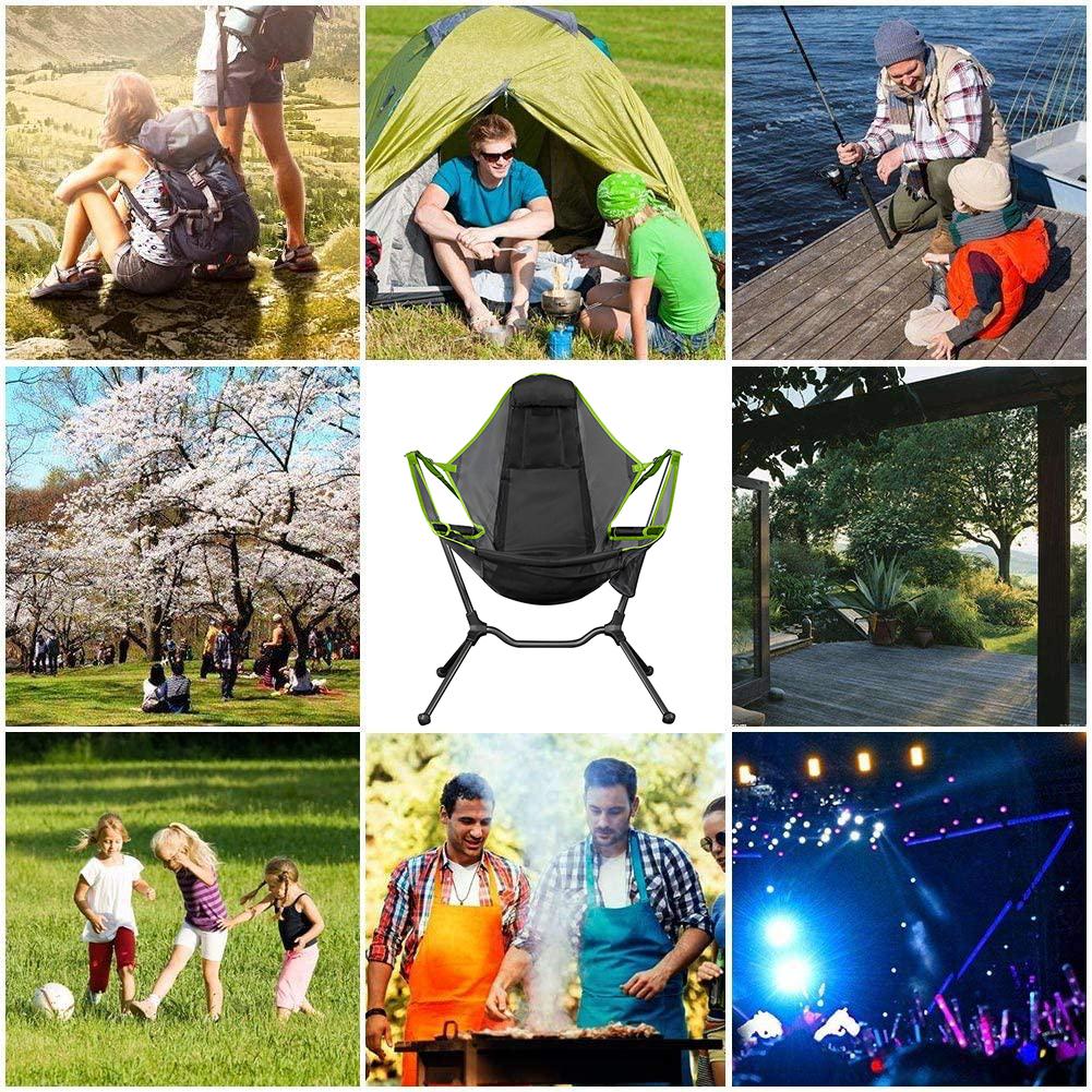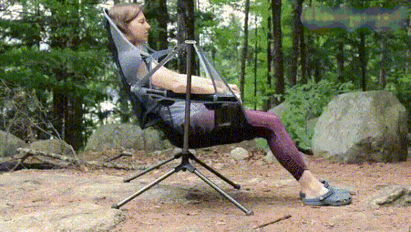 Installs on uneven ground, no need for trees Suspended on the included poles, the chair swings smoothly and gently no matter how rocky, sandy or uneven the ground is below. It’s like a rocking chair and a hammock had a child perfectly built f Durable, camp-ready construction Water-resistant mesh lets air flow freely, stands up to sun exposure and resists the build-up of odor-causing bacteria, so go ahead and recline by the shore in heat of the afternoon. When you’re ready to pack up, the chair’s aircraft-grade aluminum suspension frame breaks down Lean back with a quick shift of your body weight. A supportive headrest lets you really enjoy the view without craning or straining your neck, and when you sit up the back shifts to support a more upright position. Oh, and the armrests are padded, too.