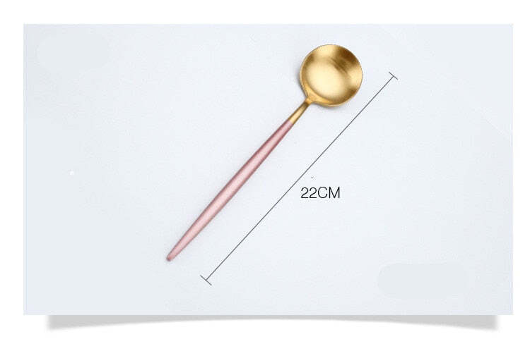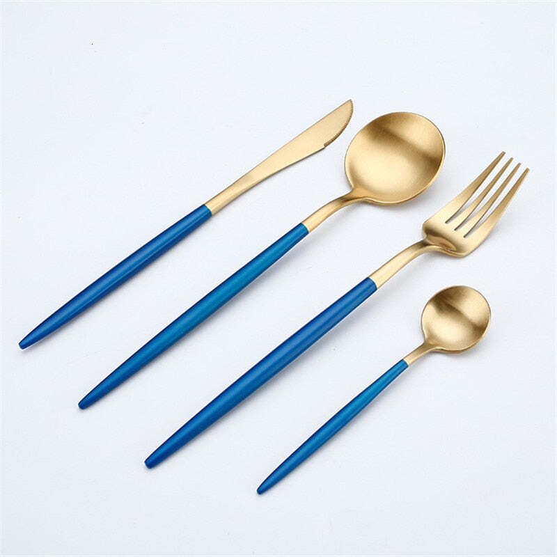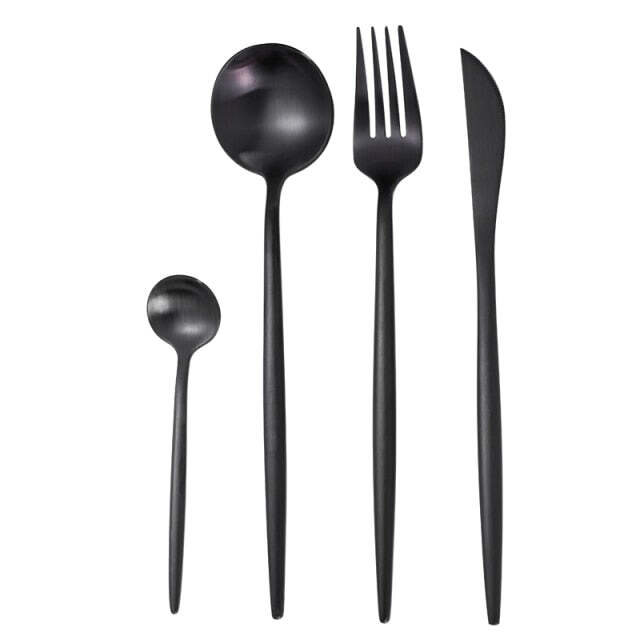 These stainless steel flatware set comes with 4pcs each: 1pc dessert spoon, 1pc dinner fork, 1pcs dinner spoons, and 1pc dinner knife