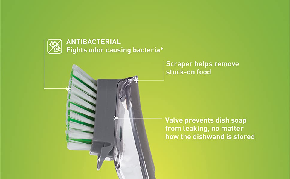 - Valve prevents dish soap from leaking, no matter how the dishwand is stored