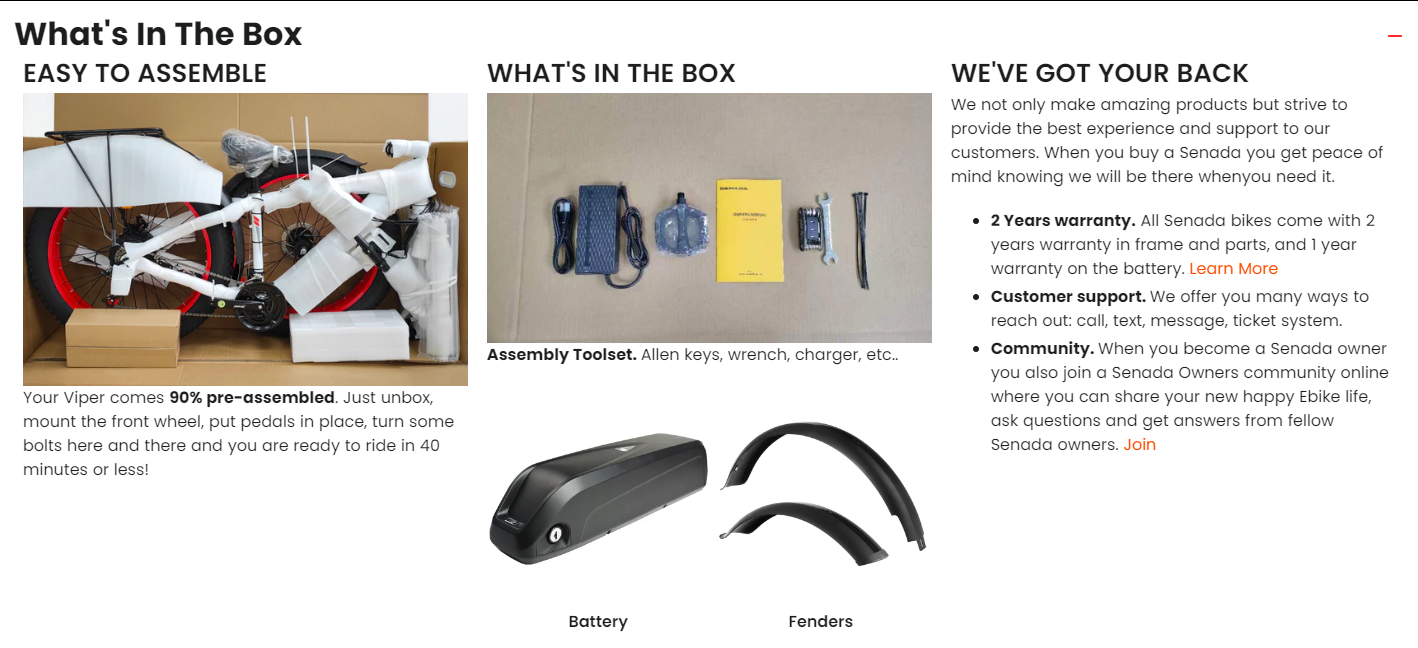 | Included | Battery, charger, pedals, assembly toolset, assembly guide, additional hardware, zip ties |