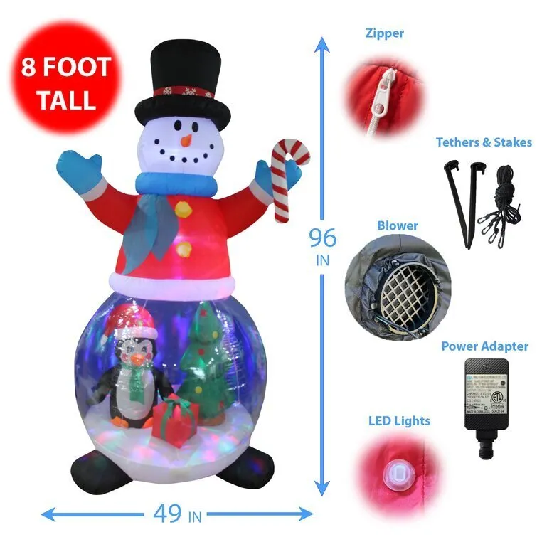 The holiday season is filled with fun a?? why not make your yard as fun as it can be with this inflatable snowman? He's just the thing to brighten up your yard with Christmas cheer. This snowman is made from polyester, and features a carrot nose, a coal smile, and a Santa-inspired shirt. But wait, there's more a?? he's also a snowglobe! A penguin, present, and tree sit inside his clear base, and are illuminated by LED lighting. When you plug it in, this snowman automatically inflates, making it easy for anyone to set him up or take him down. It arrives with stakes and a tether, though we do not recommend putting it up during storms or strong winds.