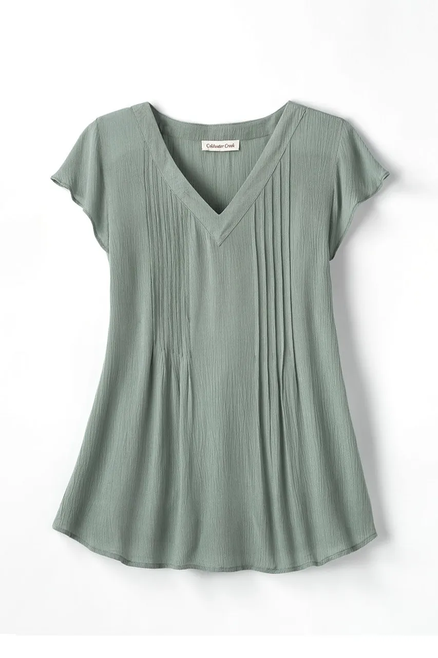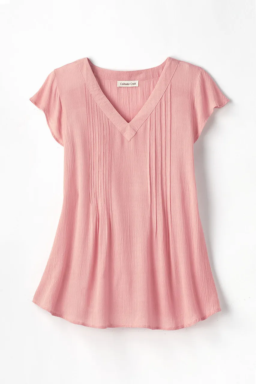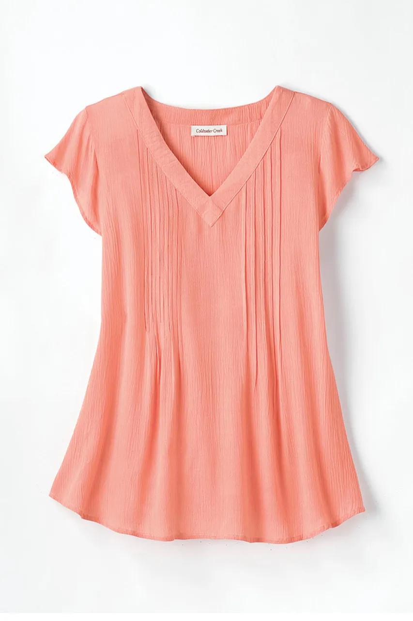 Topstitched pintucks release into an easy drape on our versatile Solstice crinkled gauze blouse �C so simple and flattering, a perfect choice for layering or on its own. V-neck, slight shirttail hem. Imported.