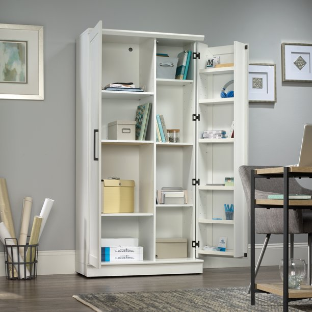 Behind each framed panel door are two adjustable shelves and one fixed shelf for customizable storage options for office supplies, pantry items, garage tools and more. Small doors include swing-out storage with three adjustable shelves and three fixed shelves - talk about storage!