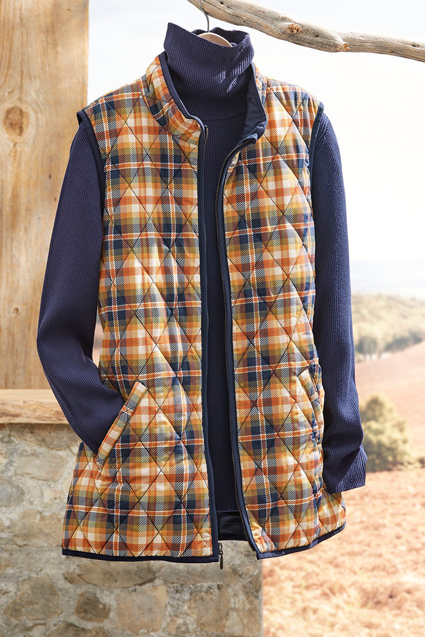 A sun-touched plaid for chill-touched days. Our lightweight quilted vest features a flattering longer length and back elastic to gently shape the waist. Zip front, with a fabric zipper guard at the neck to protect your chin. Side pockets plus two inside pockets.