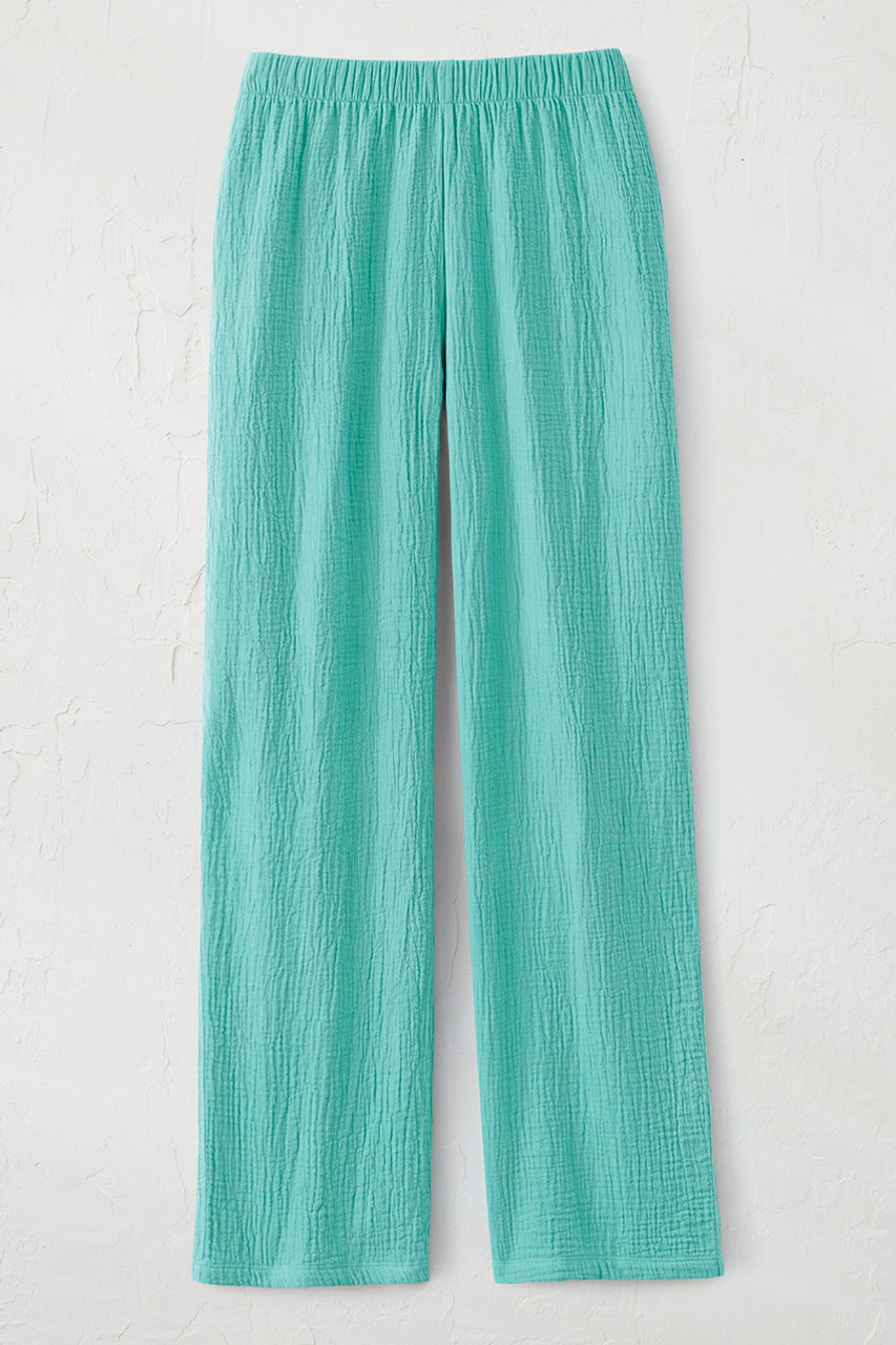 These pants really do make summer a breeze. They’re light, easy and versatile in crinkled cotton gauze, with a full elastic waist. Imported.