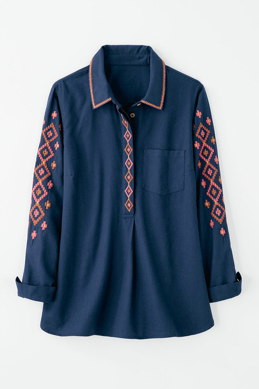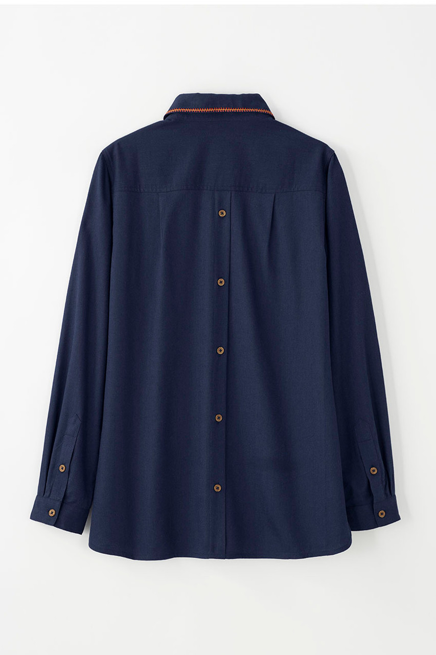 Our easy, comfortable pullover in soft twill, newly inspired with Southwest-style embroidery in sun-warmed hues. Pleated back yoke releases to a decorative button placket.