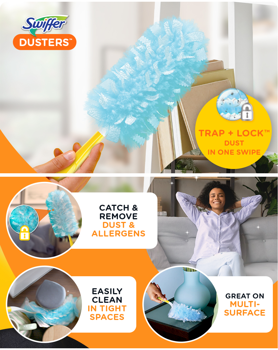 - Try Swiffer Dusters Heavy Duty to track and lock up to 3x* more dust & allergens *vs. feather duster