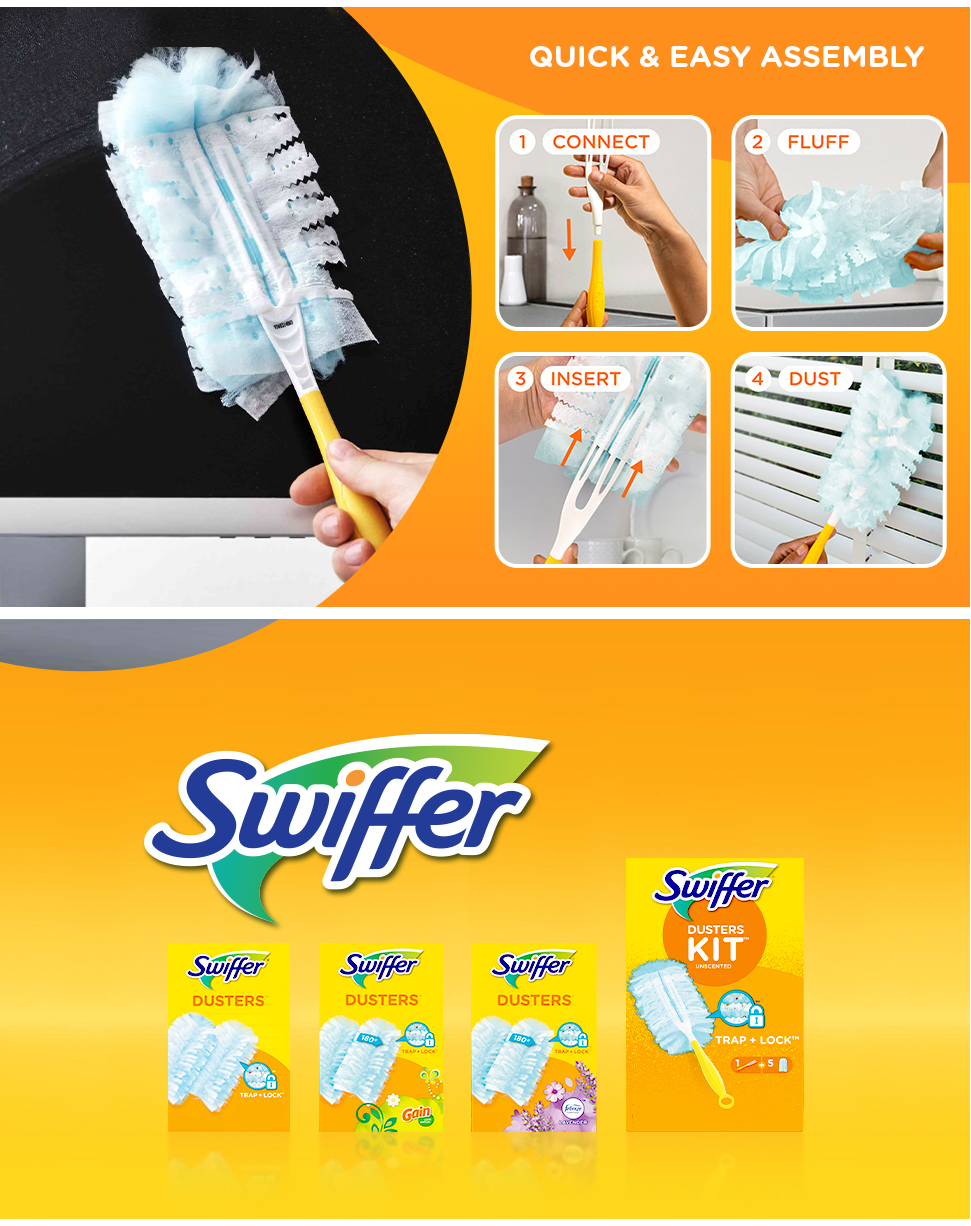 - Swiffer Dusters TRAP and LOCK dust & allergens* *common inanimate allergens from cat and dog dander & dust mite matter