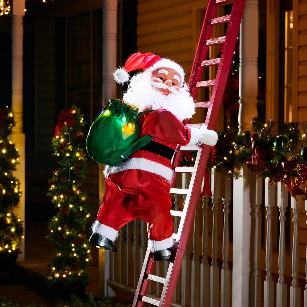 Product Story This is the animated outdoor decoration that depicts Saint Nick climbing a ladder to access your chimney. He totes his signature green sack on his back up and down the 10a??-tall ladder (each cycle is about two minutes) as the decoration plays one of 15 Christmas songs. The elf-engineered ladder attaches to a home with the included hardware or can be leaned up against a wall and supported by an included easel. With a volume control, optional six hour timer, and LED spotlights. AC adapter with 70" cord. 122" H x 48" D x 25 1/2" W. (19 lbs.)