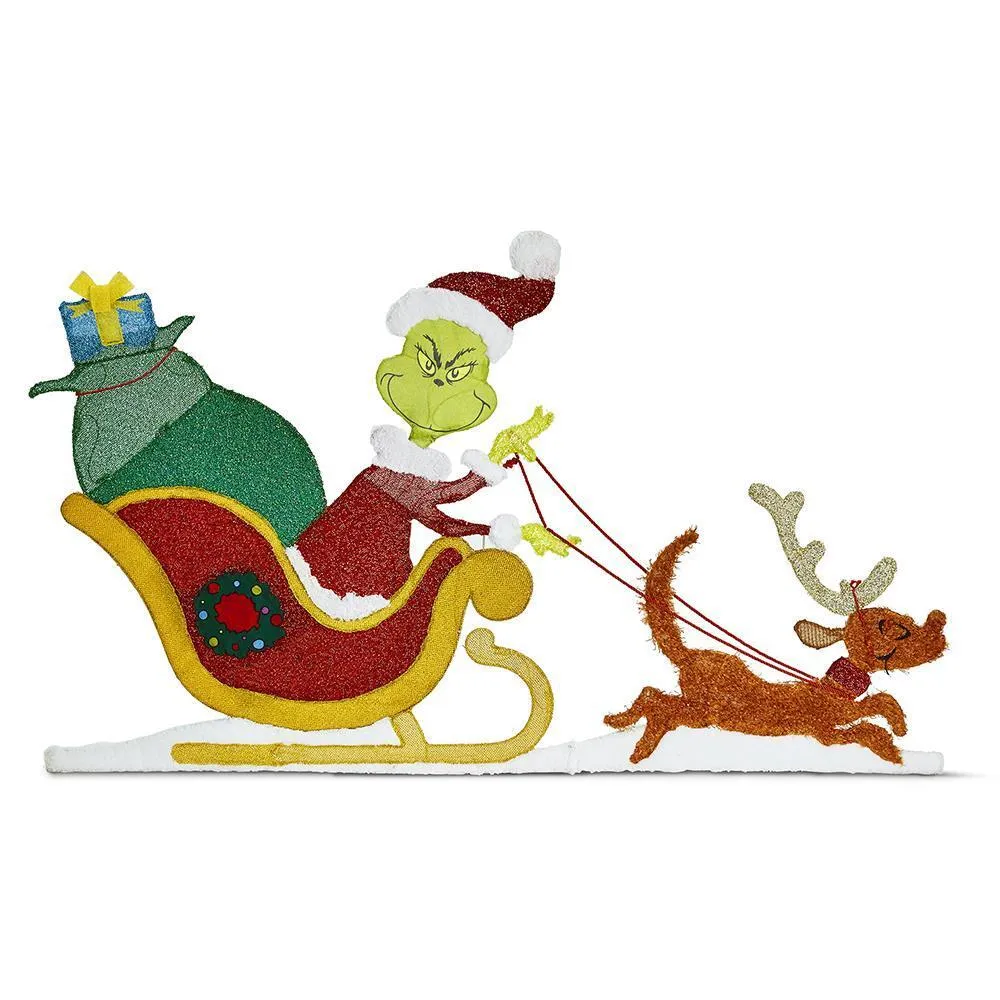 Product Story This is the illuminated Grinch who stole Christmas being pulled in his sleigh by his canine companion, Max. The 3'-high decoration is prelit with multicolor LEDs to glow delightfully on your lawn. This 2D holiday scene is made with a durable metal frame covered in colorful fabric designed to withstand years of cold and wintery weather. It secures to the ground with metal stakes (included). Minor assembly required. AC plug with 60" cord. 37" H x 57" W x 10" D. (4 lbs.)