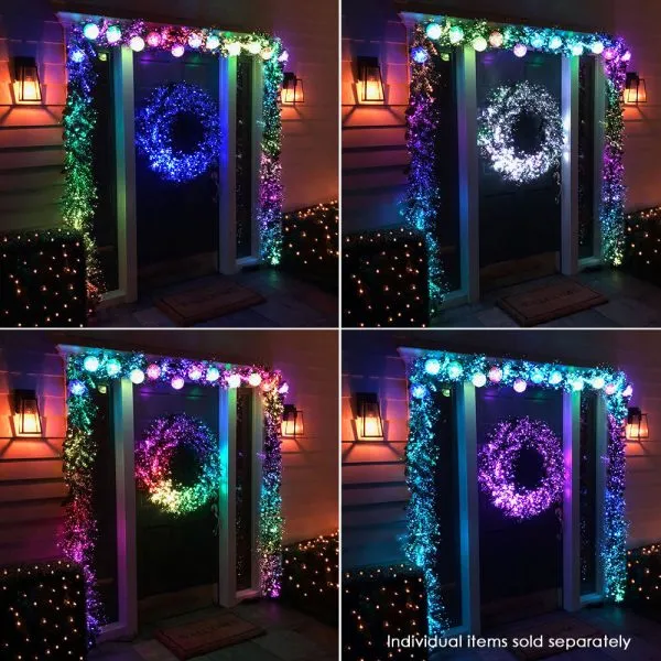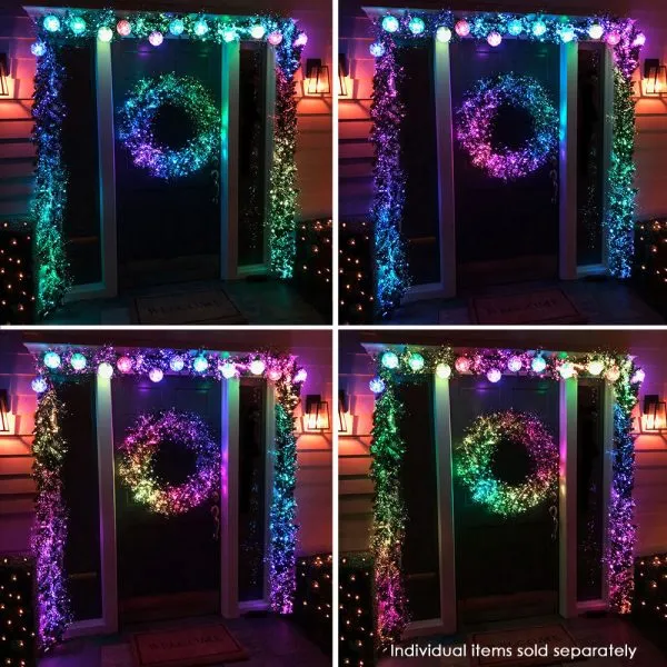 This is the 36″ diameter wreath that displays a brilliant fiber-optic holiday light show. Ideal for hanging over a fireplace or displaying on a front door, the fiber-optic strands are tucked among the wreath’s PVC tips that are realistically molded to replicate the growth patterns of actual conifers. Using 15 LEDs to illuminate 320 fiber-optic tips, the wreath lights a room or porch with 16 different shimmering displays of dancing color. AC plug with 70″ long cord.