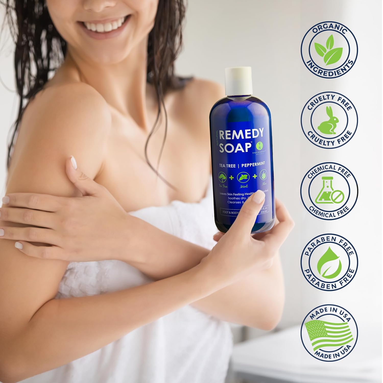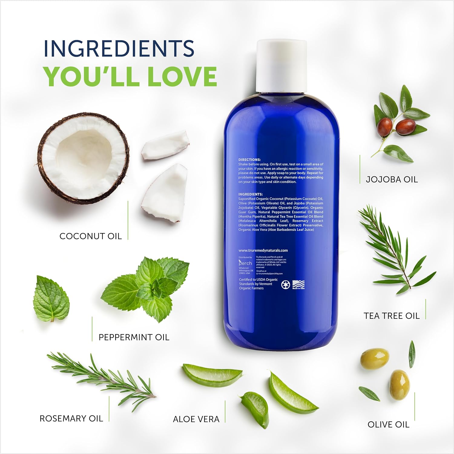- NATURAL ORGANIC SOAP MADE IN USA - Our tea tree oil body wash is made from premium botanical tea tree oil and peppermint oil, which are well known for naturally helping skin irritations. We added jojoba oil, coconut oil, and olive oil to moisturize, refresh, and deodorize. No parabens, preservatives, petroleum, sulfate, silicone, synthetic fragrances, or dyes. Made in the USA.