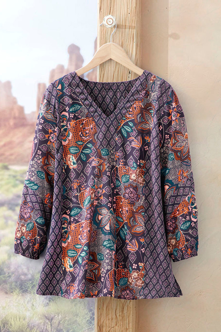 Find your harmony in this popover tunic, with a striking mix of vintage floral and geometric batik prints. Princess seams add flattering flow.
