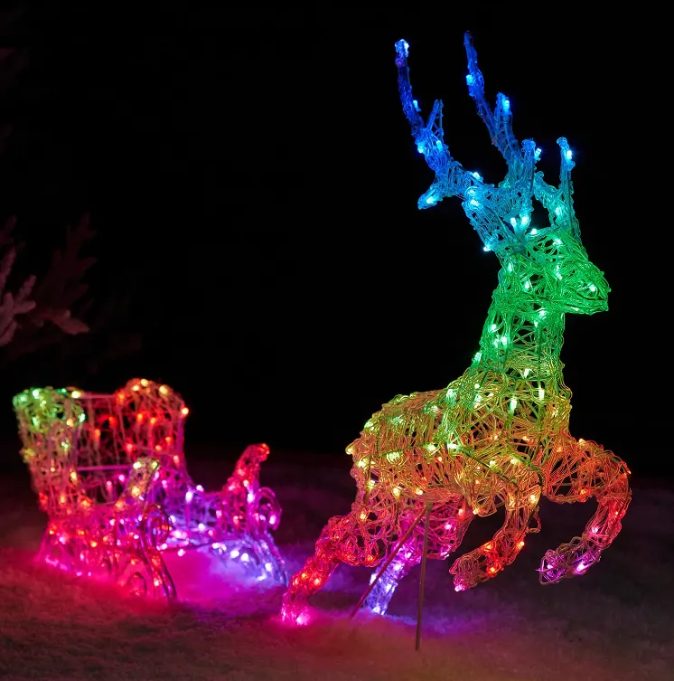 Sleigh. 120 LEDs. 32 1/2" H x 50" W x 17" D. (13 3/4 lbs.) Reindeer. 160 LEDs. 42" H x 51" W x 9 1/2" D. (8 1/4 lbs.)