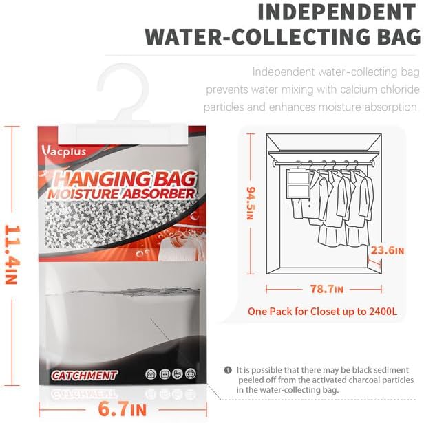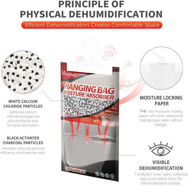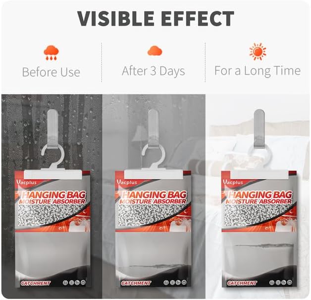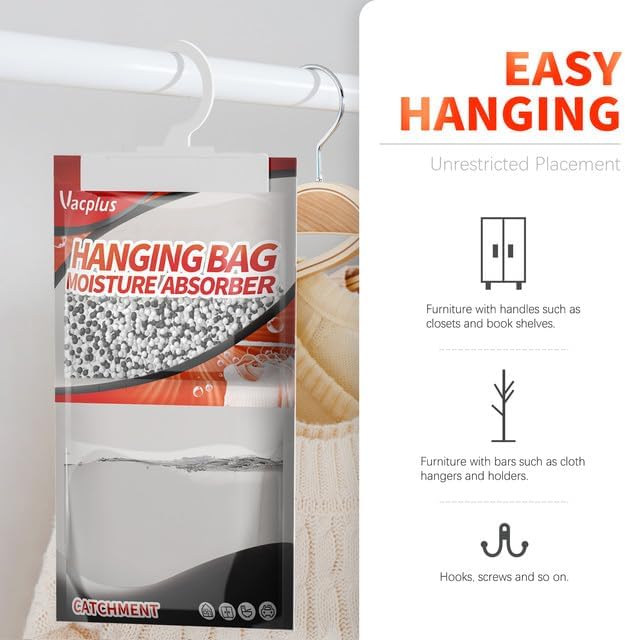 - EASY & SAFE: Vacplus moisture absorber packets provide an easy solution to protecting items and fabrics from excess moisture. By Hanging them up, physical dehumidification gives you a Safe, Green & Energy-saving life.