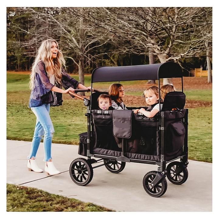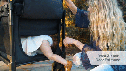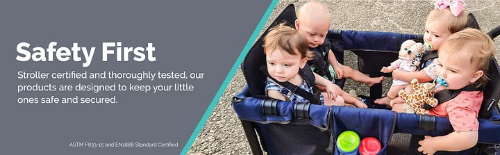 The stroller is designed with two 5-point adjustable safety harnesses and incredible automatic magnetic buckle. Additionally, each wagon comes with a front zipper door for children's easy access, a deep carriage with mesh panels for increased ventilation, and additional storage throughout to hold everything you need on the go.
