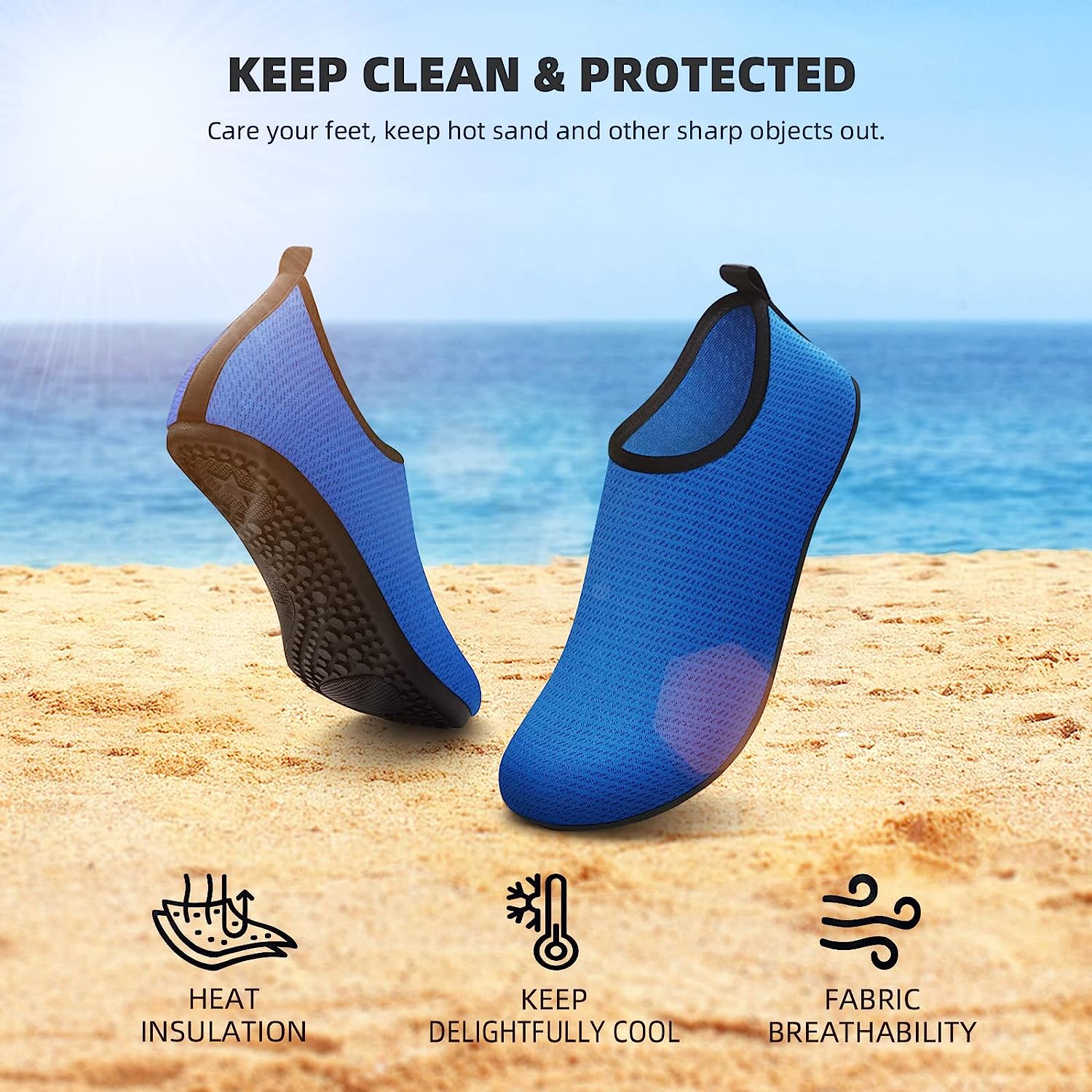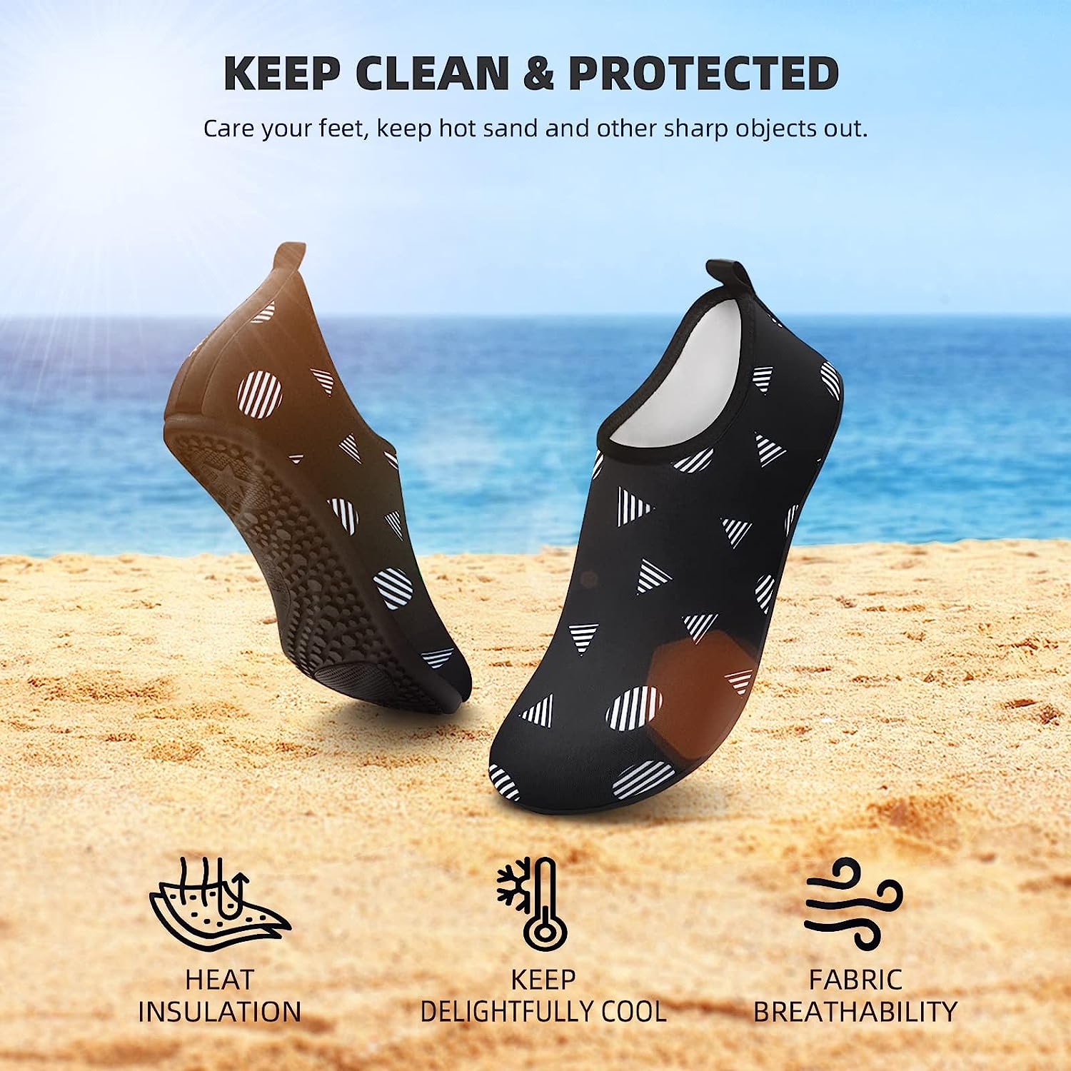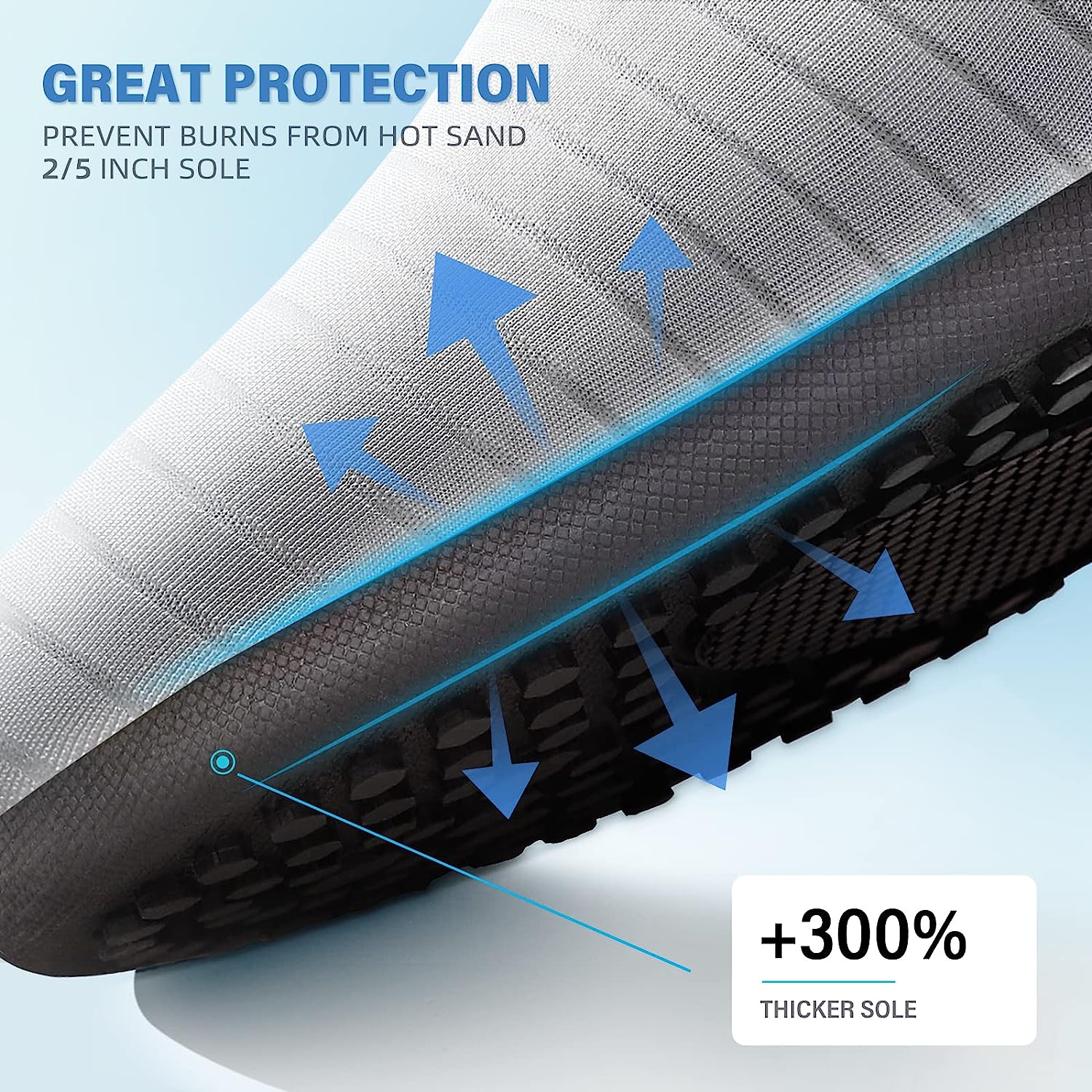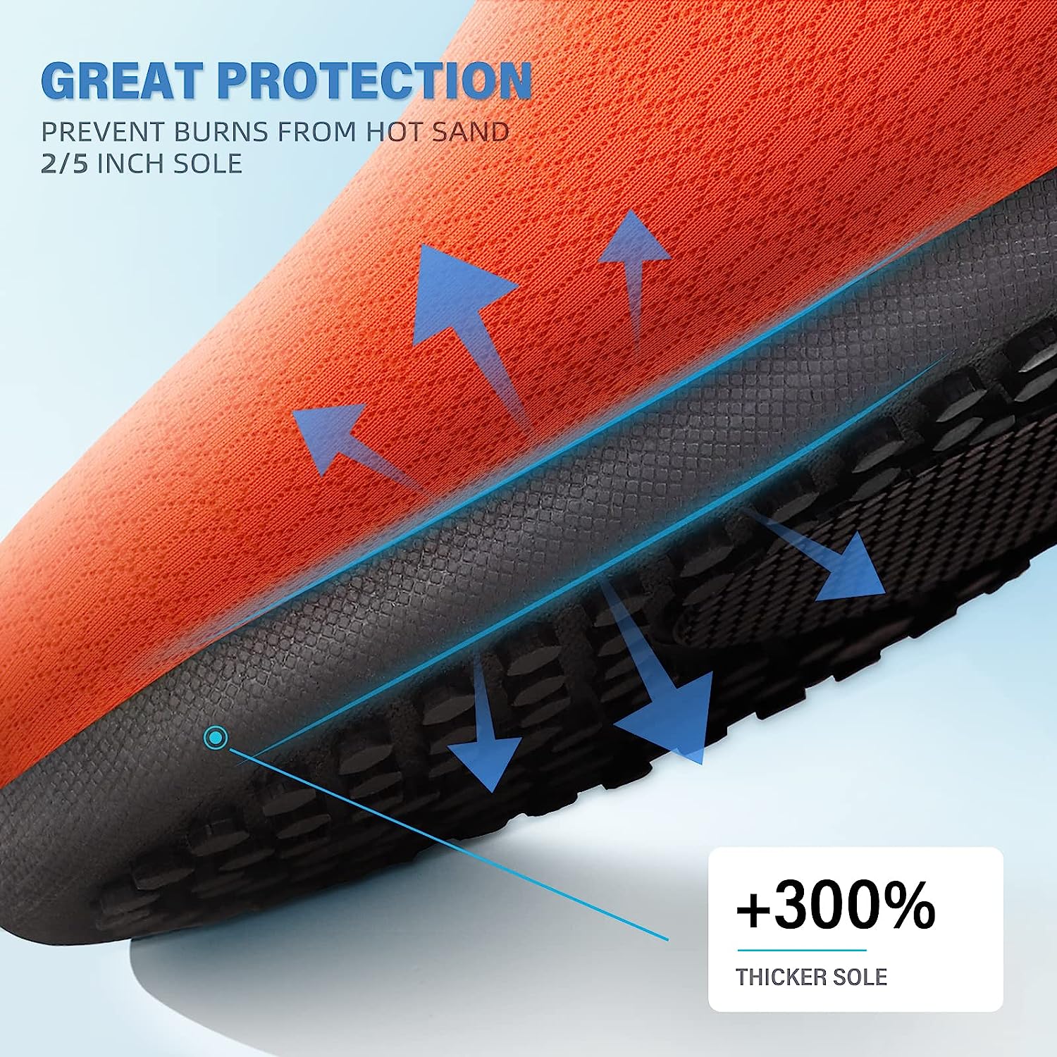 - 𝗣𝗥𝗢𝗧𝗘𝗖𝗧𝗜𝗩𝗘 - Water shoes for men women are made available for both water use and dry land.The special anti-slip sole can not only protect your feet from sharp things like rocks,shells and gravel,but also prevent burns from hot sand in beach or water park.And beach shoes' smooth neck design would take care of your ankles.
