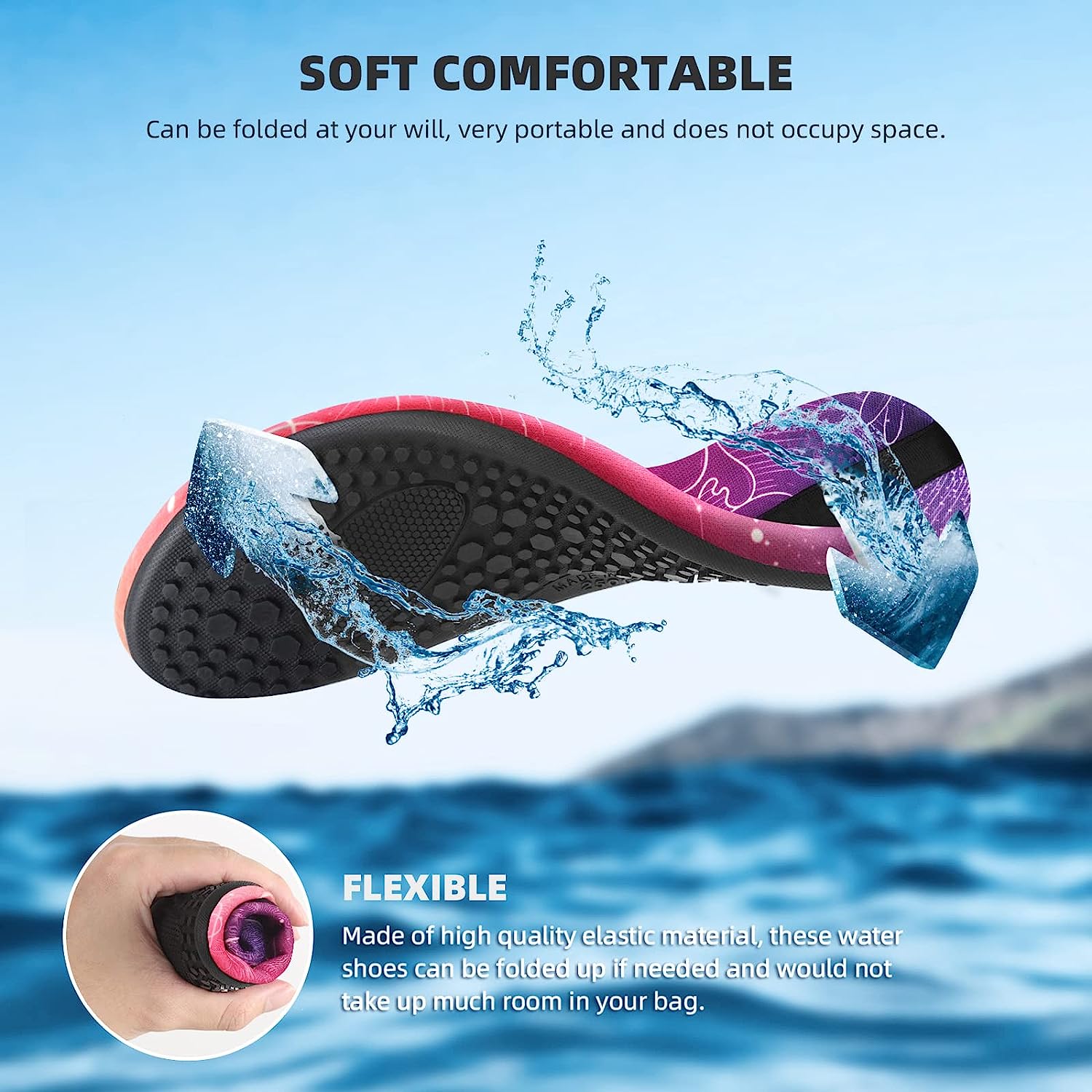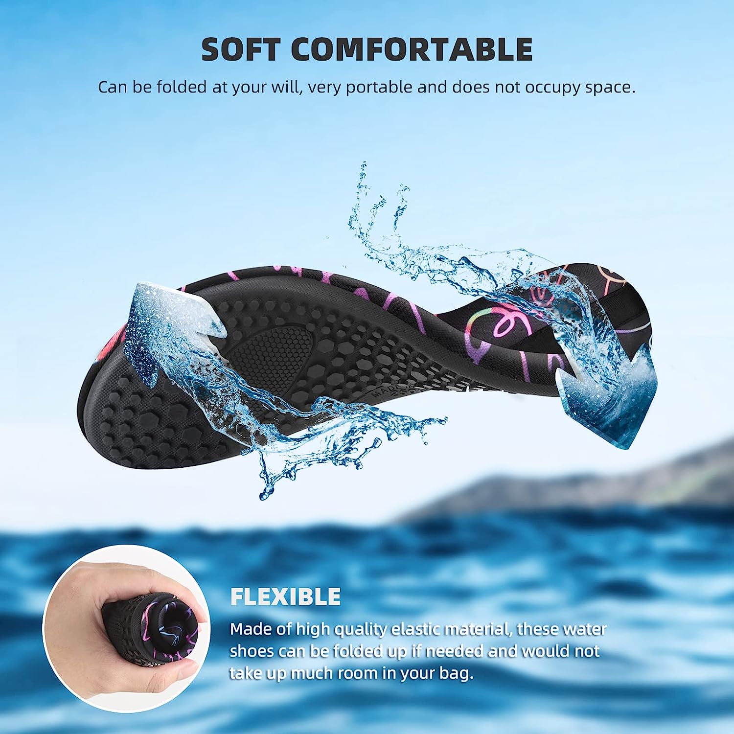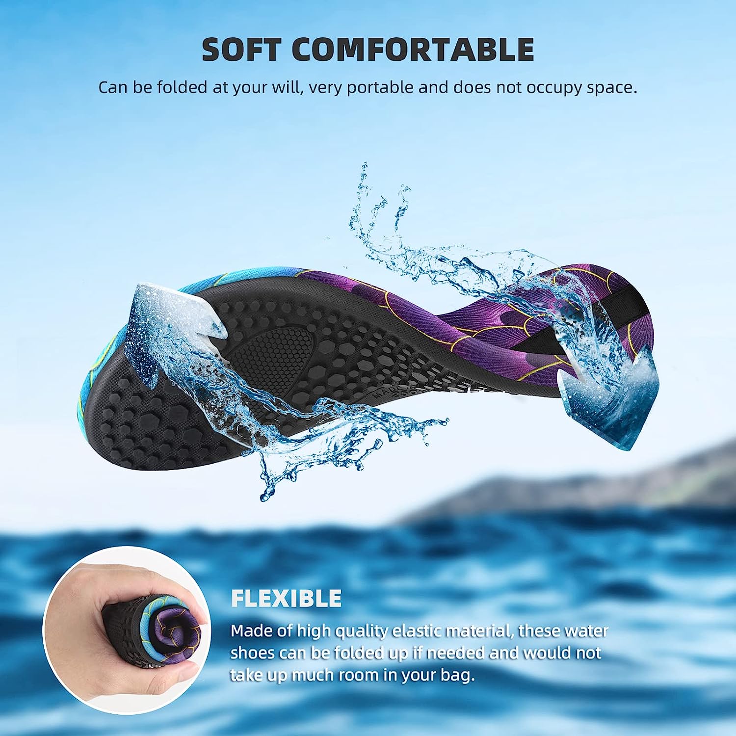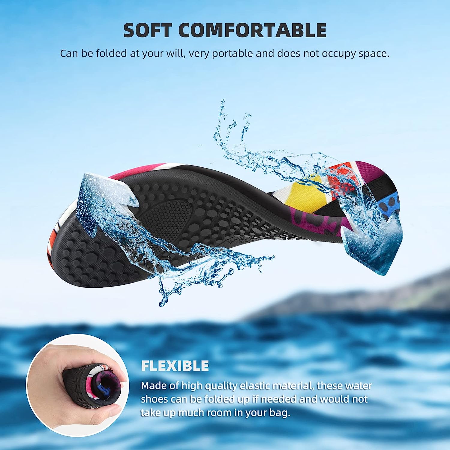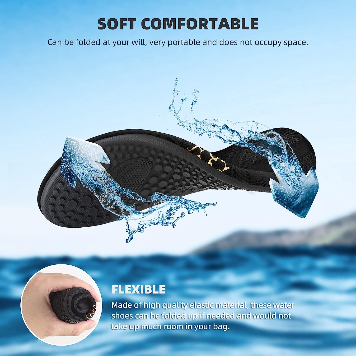 - 𝗖𝗢𝗡𝗩𝗘𝗡𝗜𝗘𝗡𝗖𝗘 & 𝗗𝗨𝗥𝗔𝗕𝗜𝗟𝗜𝗧𝗬 - Our swim shoes are lightweight, flexible and foldable,really easy to put on and carry out.Compared with ordinary beach aqua socks,the special thick sole design can effectively help the upper not easy to be damaged and more durable.