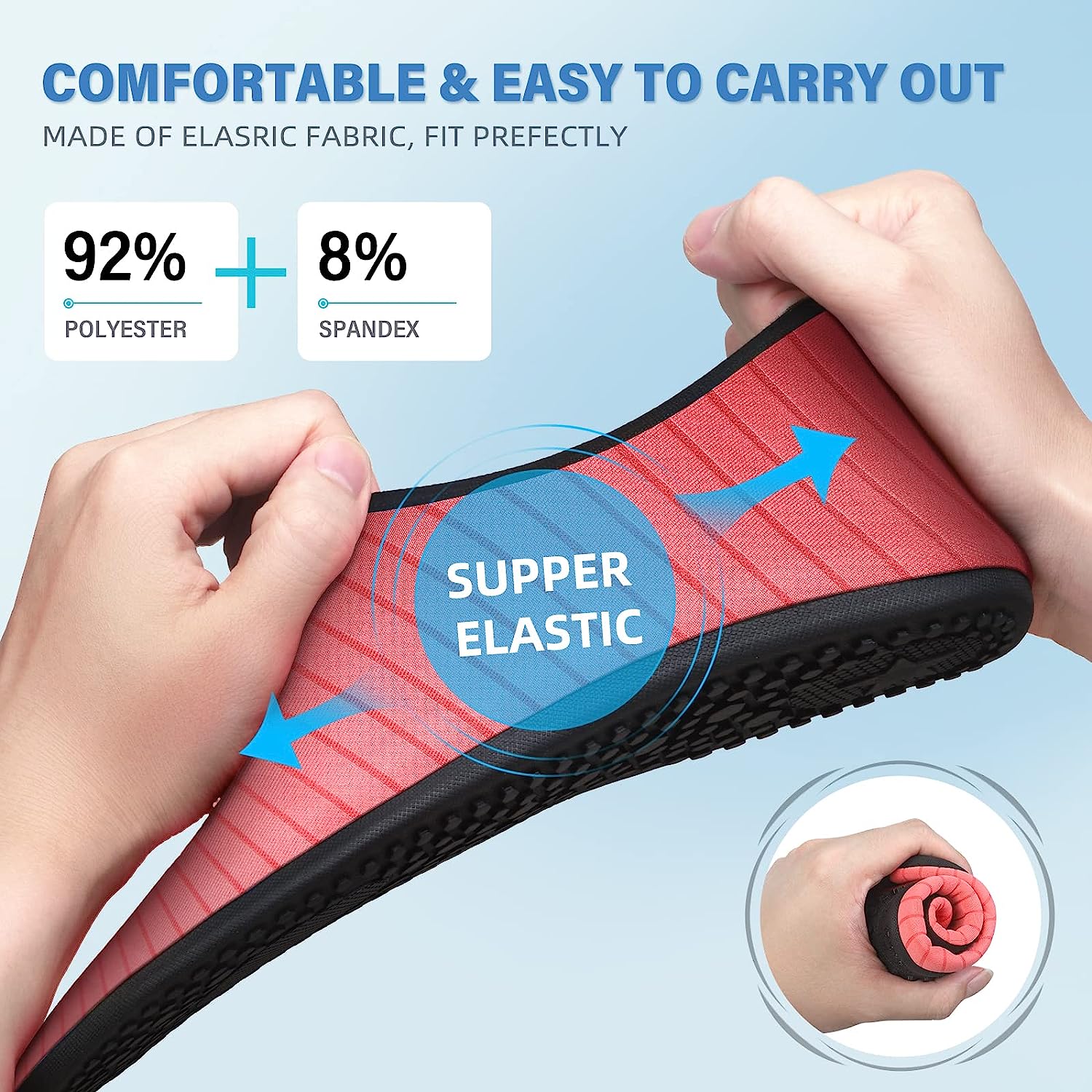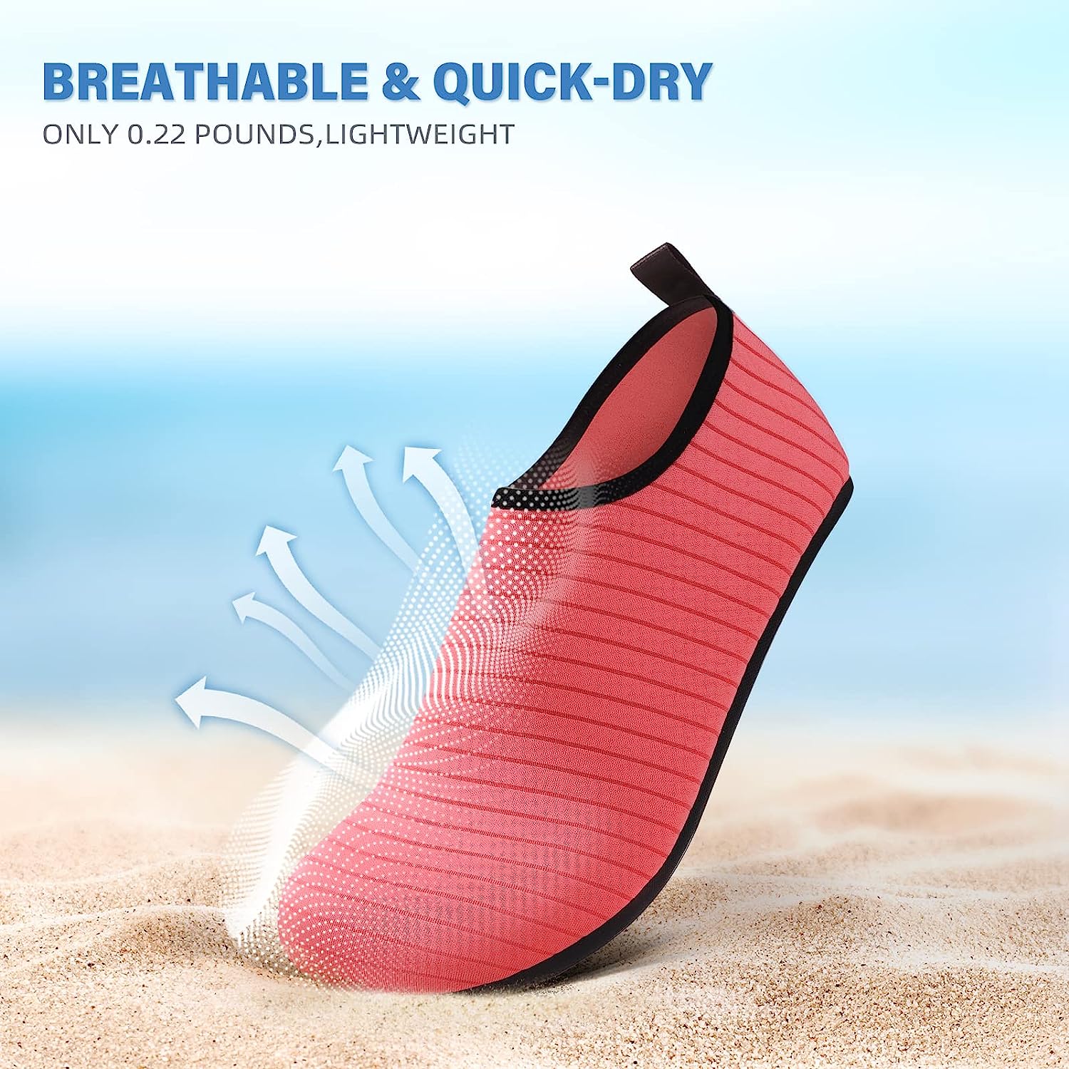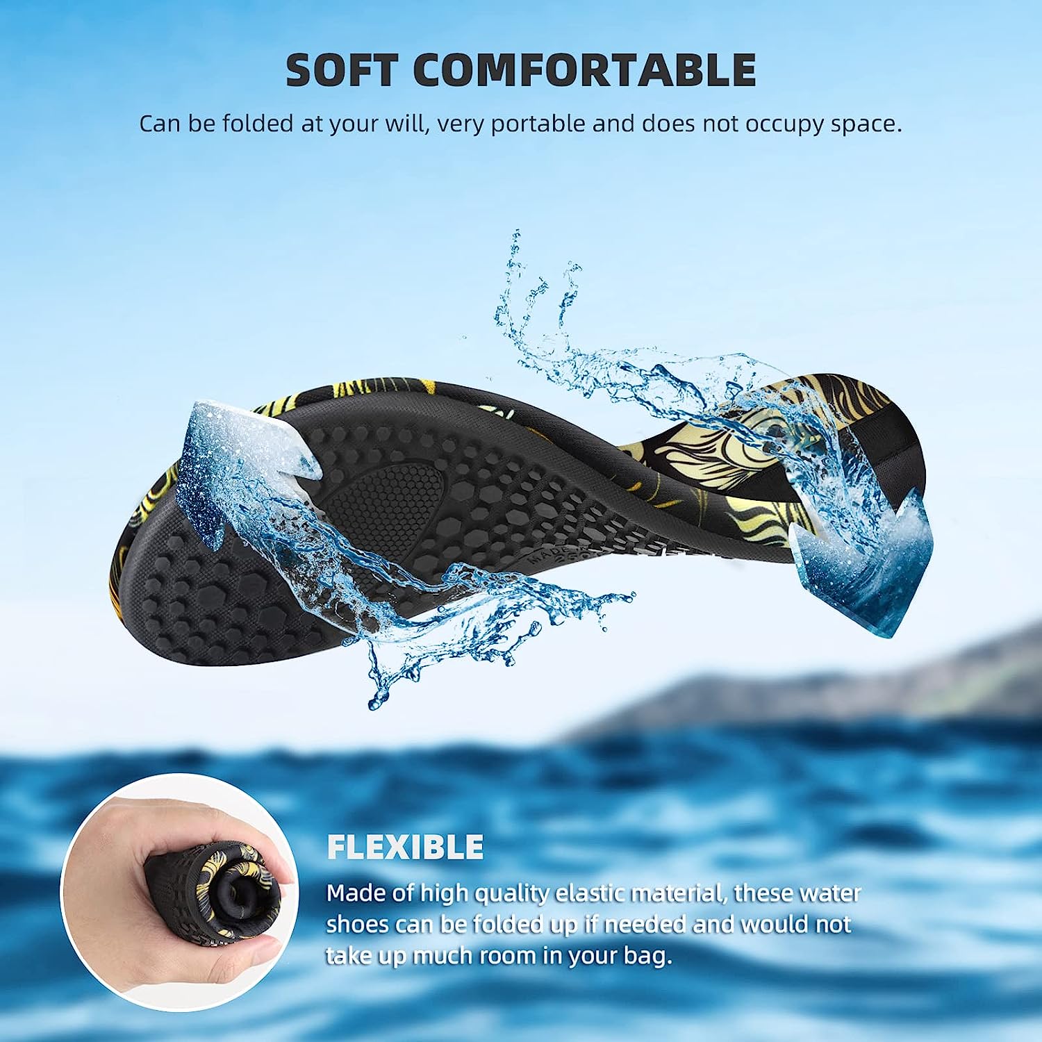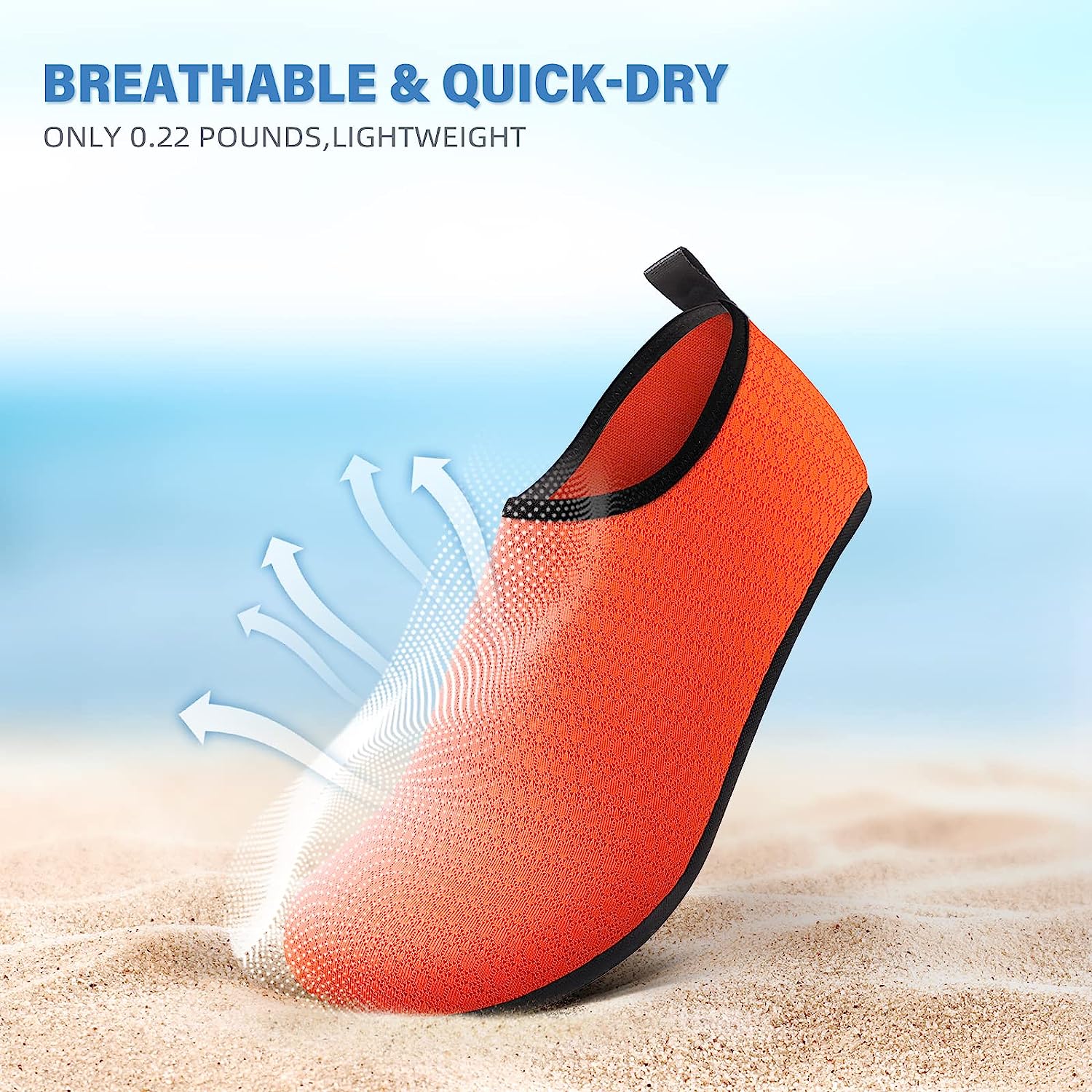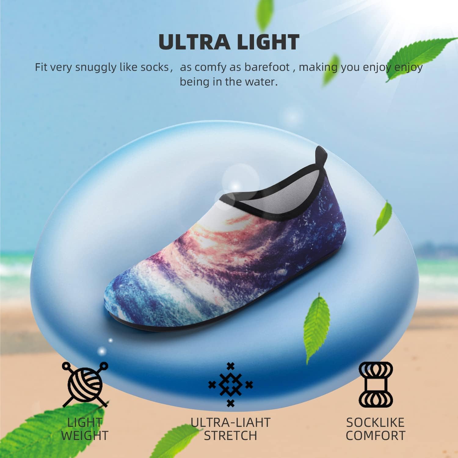 - 𝗖𝗢𝗡𝗩𝗘𝗡𝗜𝗘𝗡𝗖𝗘 & 𝗗𝗨𝗥𝗔𝗕𝗜𝗟𝗜𝗧𝗬 - Our swim shoes are lightweight, flexible and foldable,really easy to put on and carry out.Compared with ordinary beach aqua socks,the special thick sole design can effectively help the upper not easy to be damaged and more durable.