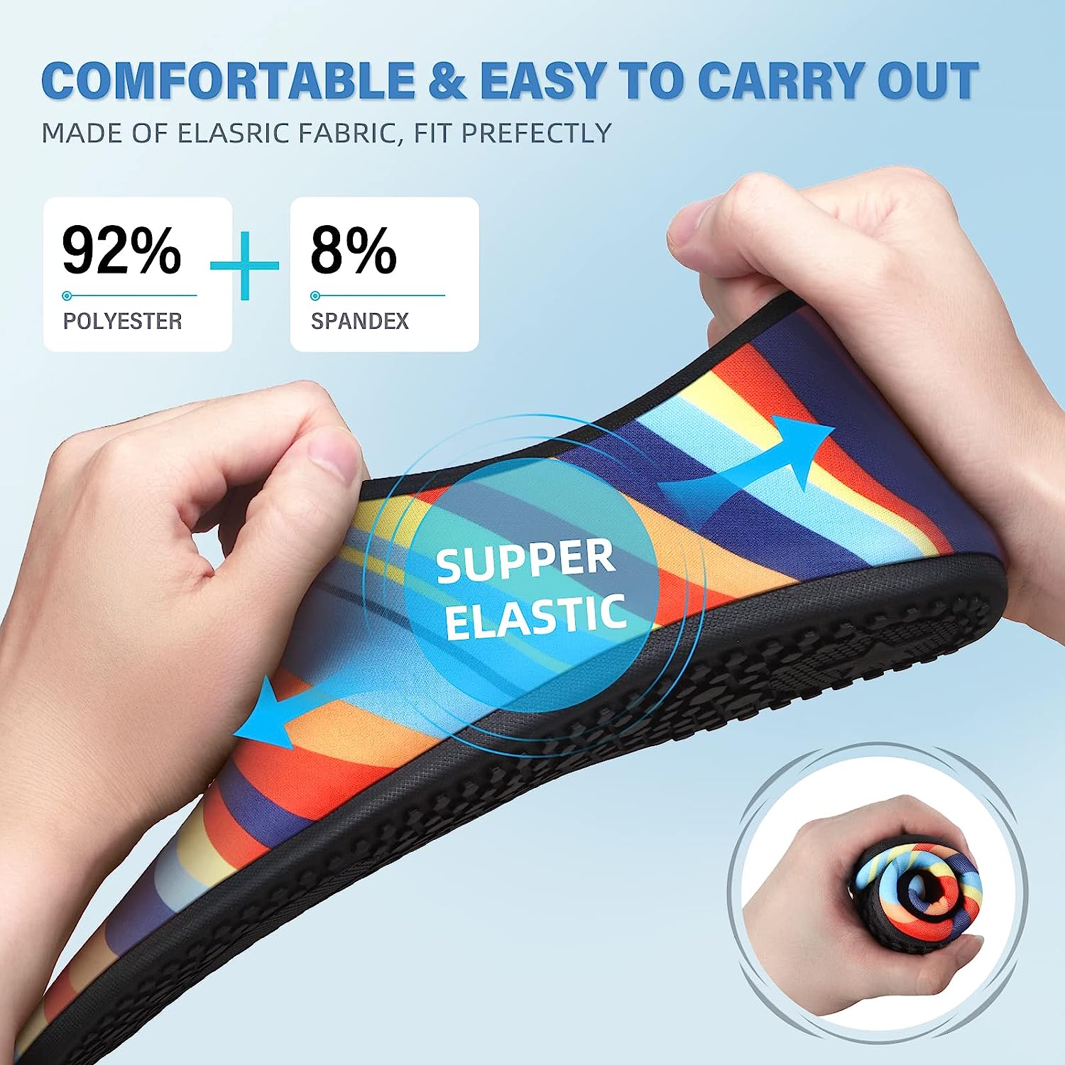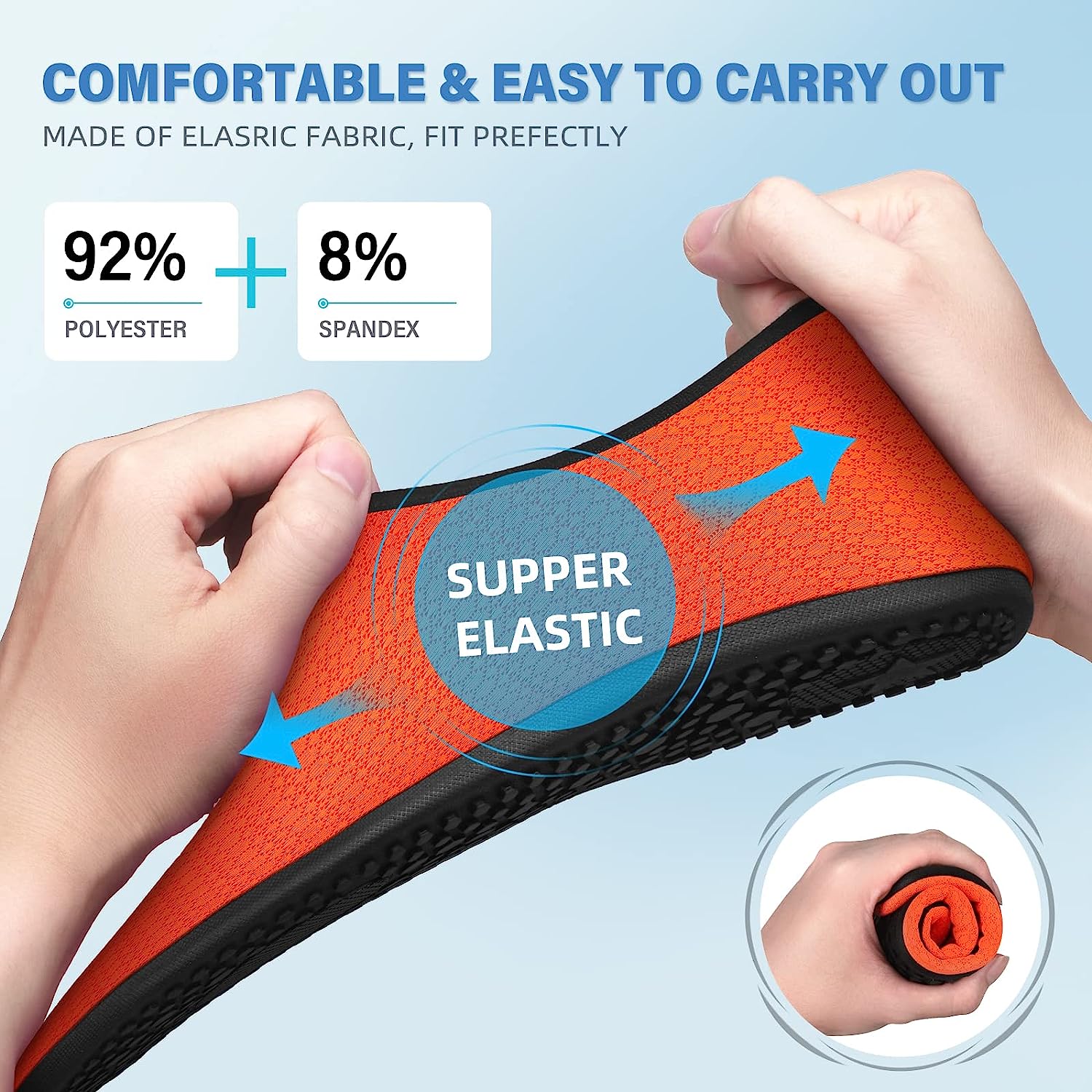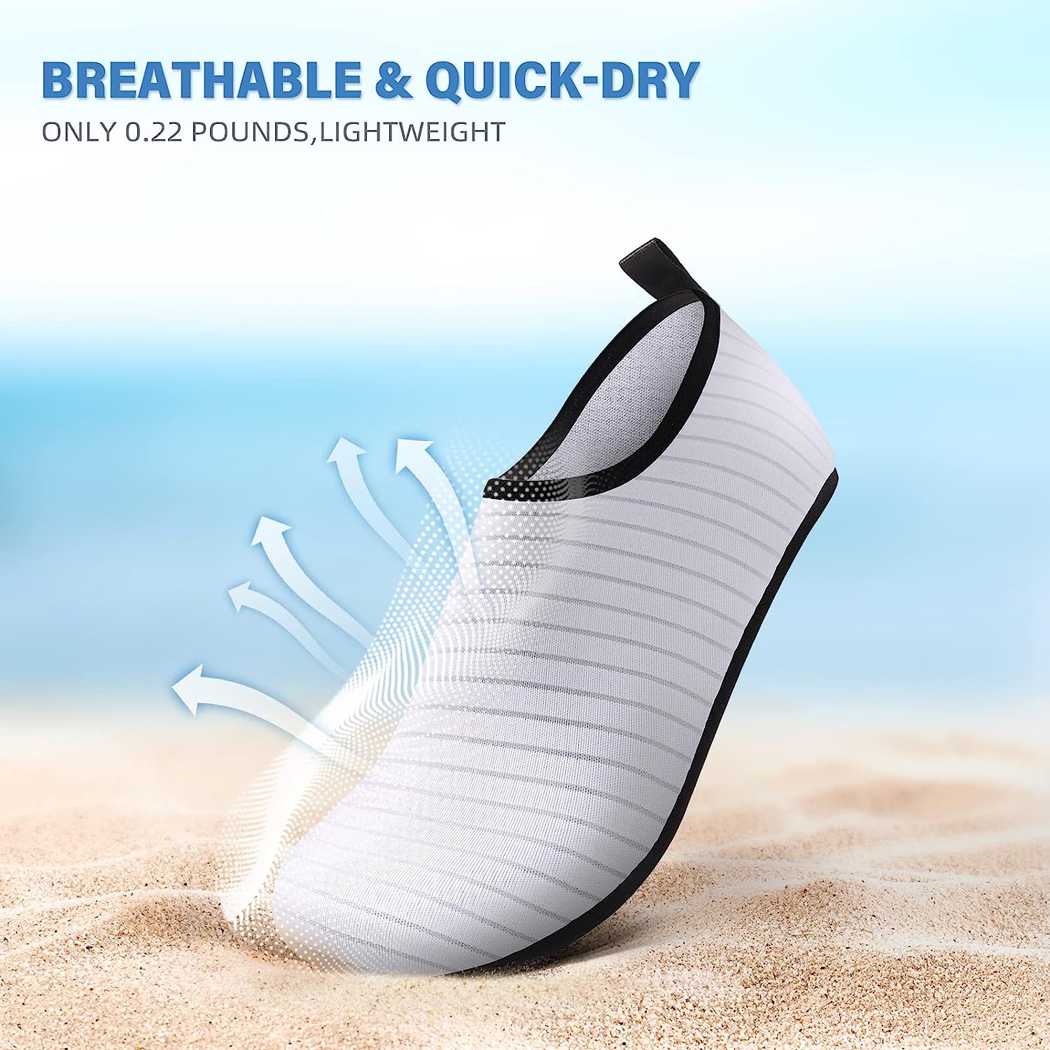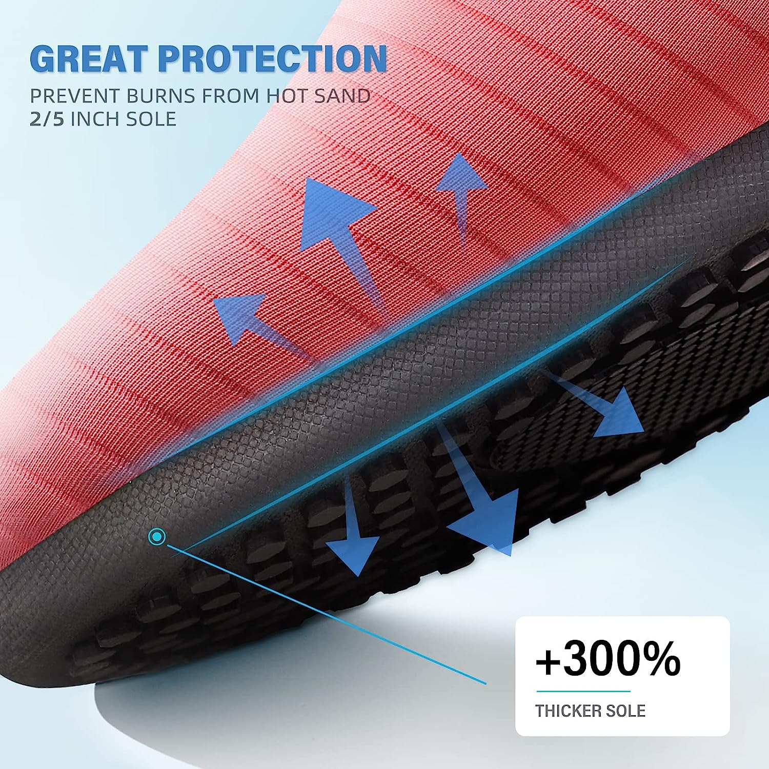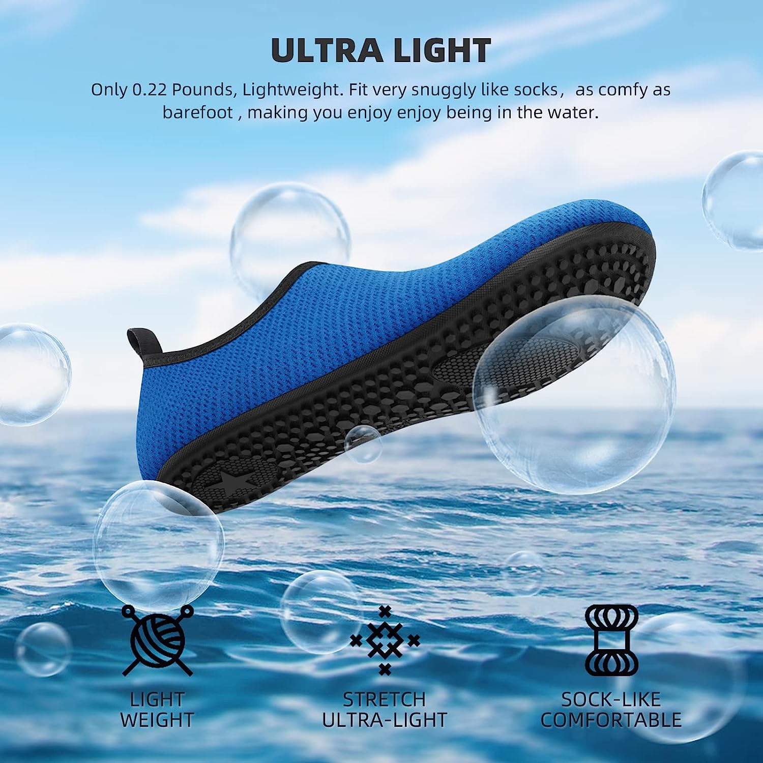 - 𝗖𝗢𝗡𝗩𝗘𝗡𝗜𝗘𝗡𝗖𝗘 & 𝗗𝗨𝗥𝗔𝗕𝗜𝗟𝗜𝗧𝗬 - Our swim shoes are lightweight, flexible and foldable,really easy to put on and carry out.Compared with ordinary beach aqua socks,the special thick sole design can effectively help the upper not easy to be damaged and more durable.