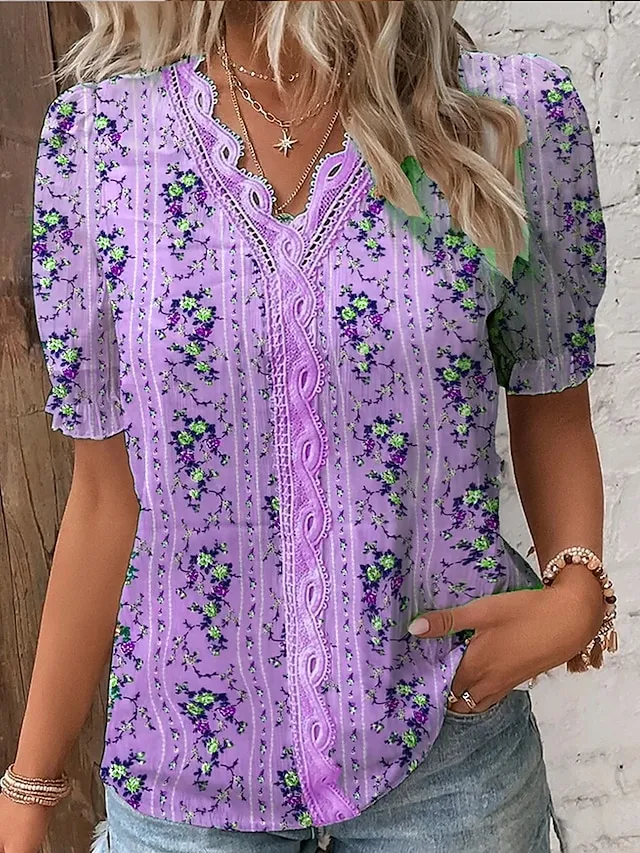 • Women's Shirt Blouse Blue Purple Green Floral Lace Trims Print Short Sleeve Casual Holiday Basic V Neck Long Floral S