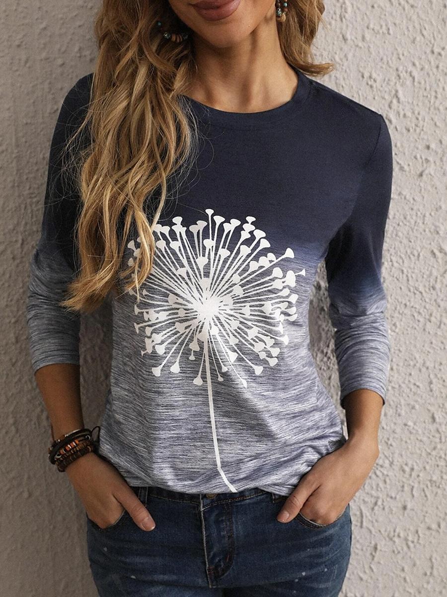 Gender:Women's, Style:Casual, Occasion:Daily, Tops Type:T shirt Tee, Neckline:Crew Neck, Fabric:Polyester, Design:Print, Sleeve Length:Long Sleeve, Elasticity:Micro-elastic, Look After Me:Wet and Dry Cleaning,Washable,Machine wash, Pattern:Dandelion,Ombre, Season:Fall,Spring, Length (cm):S:65;M:66.5;L:68;XL:69.5;2XL:71,