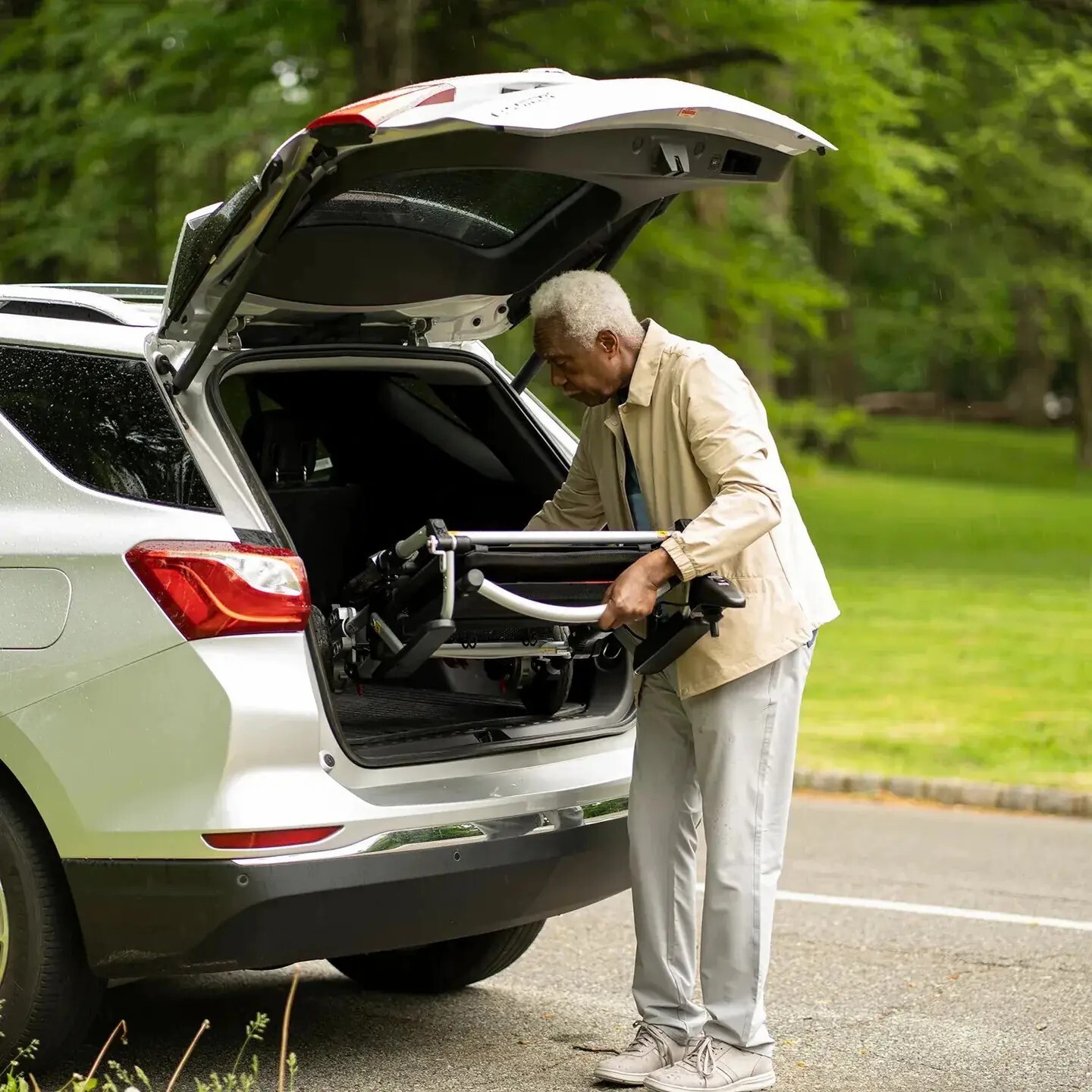 • Easy folding with a single pull release cable; once folded, it fits into the backseat or trunk of a car and can be wheeled like a piece of luggage