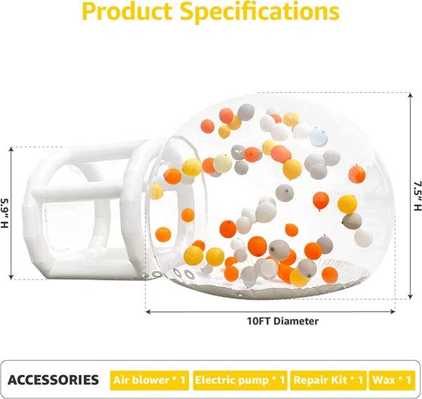 Size: Bubble 10 ft (diameter) x 7.5 ft (height)