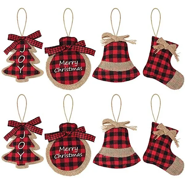 Christmas-Christmas decorations tree ornament 8 pcs red black buffalo check plaid stitching burlap hanging ornaments tree ball bell stocking shaped hanging decor for holiday xmas party decorations gift