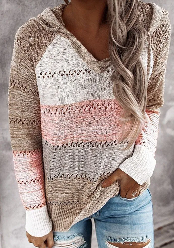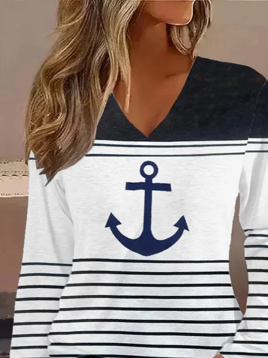Women Striped V Neck Casual Long Sleeve T-shirt