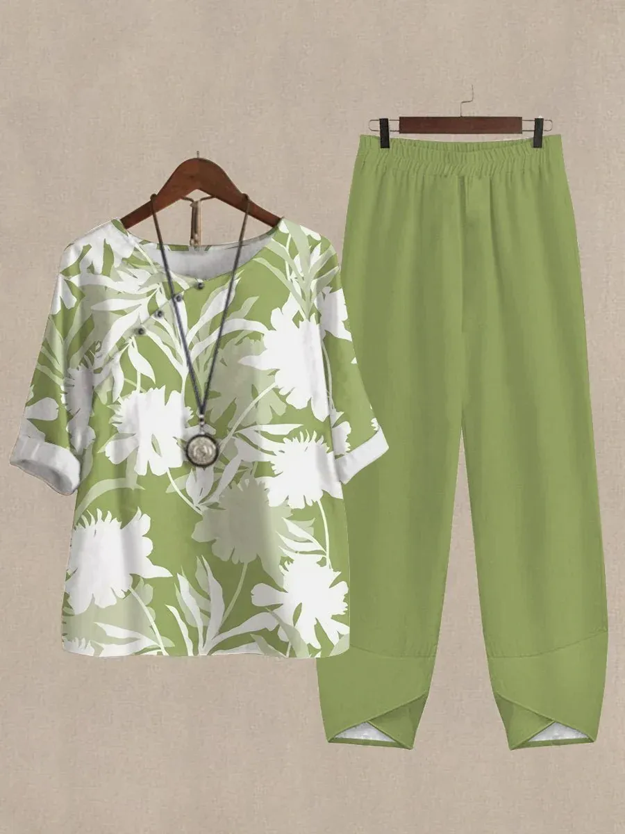 Women's Leaf Print Half Sleeve Top And Wide Leg Pants Two Pieces