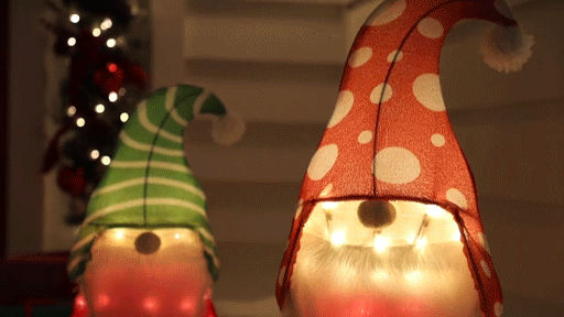 Each colorful little fellow is illuminated with warm white LEDs to brighten your yard. One of the gnomes sports a cheerful red polka dot stocking cap over his full snow-white beard, while his shorter brother dons a green striped hat. Both gnomes are constructed from durable prelit metal frames covered by weatherproof fabric.