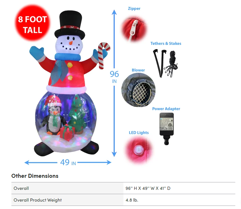 The holiday season is filled with fun a?? why not make your yard as fun as it can be with this inflatable snowman? He's just the thing to brighten up your yard with Christmas cheer. This snowman is made from polyester, and features a carrot nose, a coal smile, and a Santa-inspired shirt. But wait, there's more a?? he's also a snowglobe! A penguin, present, and tree sit inside his clear base, and are illuminated by LED lighting. When you plug it in, this snowman automatically inflates, making it easy for anyone to set him up or take him down. It arrives with stakes and a tether, though we do not recommend putting it up during storms or strong winds.