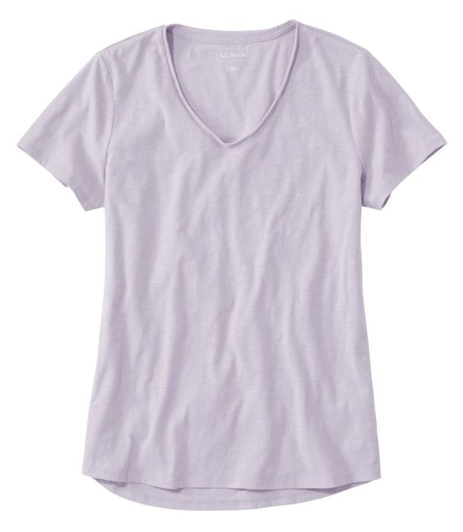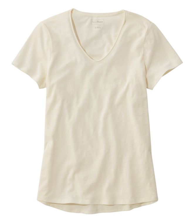 - V-neck has a raw edge that rolls slightly for feminine style.