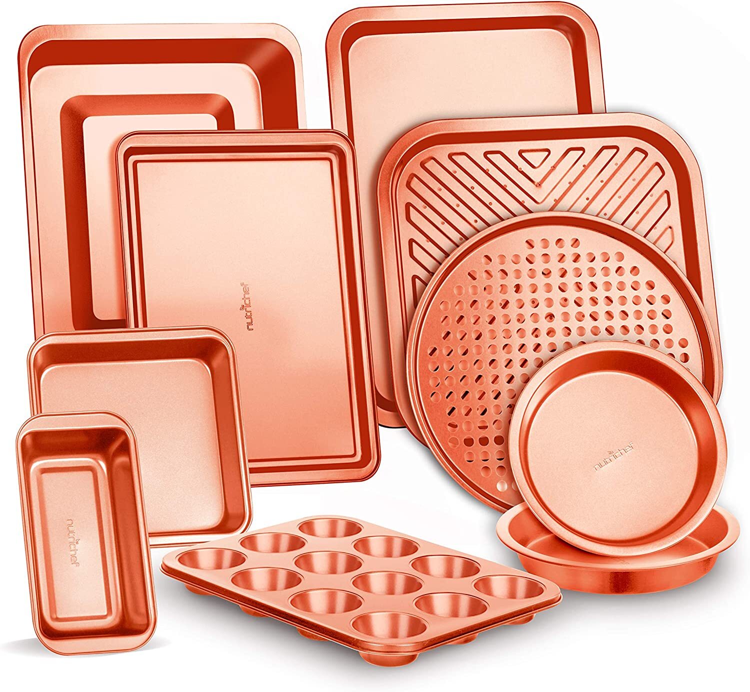 • REAL COOKING BAKING STARTER KIT – ten-piece bake-ware set includes the most popular pans needed to become a master chef. It is a basic starter kit and makes the perfect gift for an aspiring chef. It includes 1 crisper pan, 1 cupcake tray, 1 loaf pan, 1 small cookie sheet, 1 large cookie sheet, 1 round pizza pan, 2 round cake pans, 1 square pan, and 1 large roasting pan.