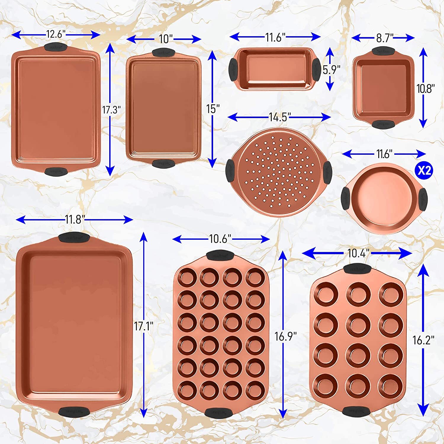 • VERSATILITY IN BOTH SQUARE AND ROUND SHAPES – This variety of durable pans in various shapes and sizes pairs with gastronomic dishes across the culinary spectrum. Whether it is a muffin, a meatloaf, pizza, or a layered brookie pie, there’s a pan in here to pair with every dish out there. These pans are ideal for all kinds of cooking methods including cooking, baking, frying, roasting, sautéing, steaming, poaching, stir-frying, etc.